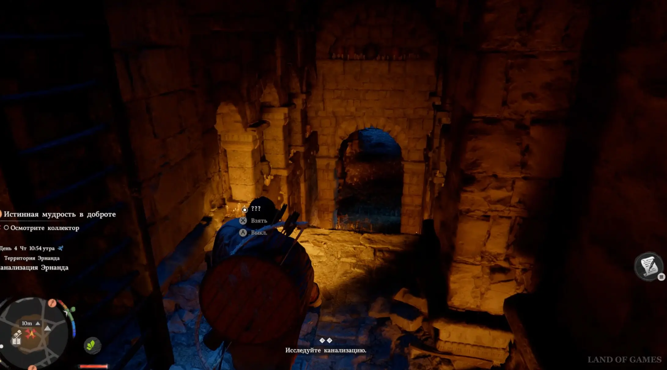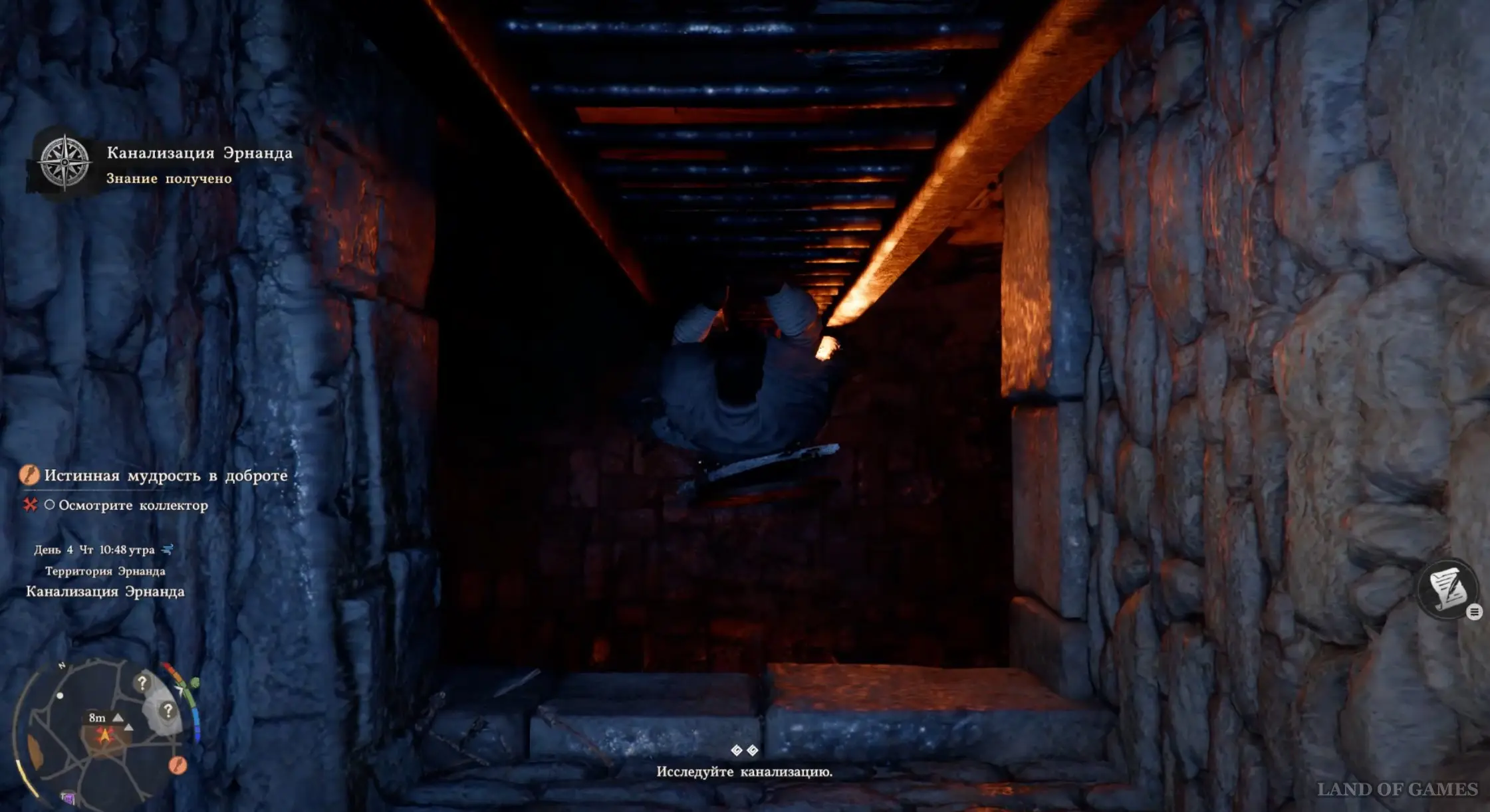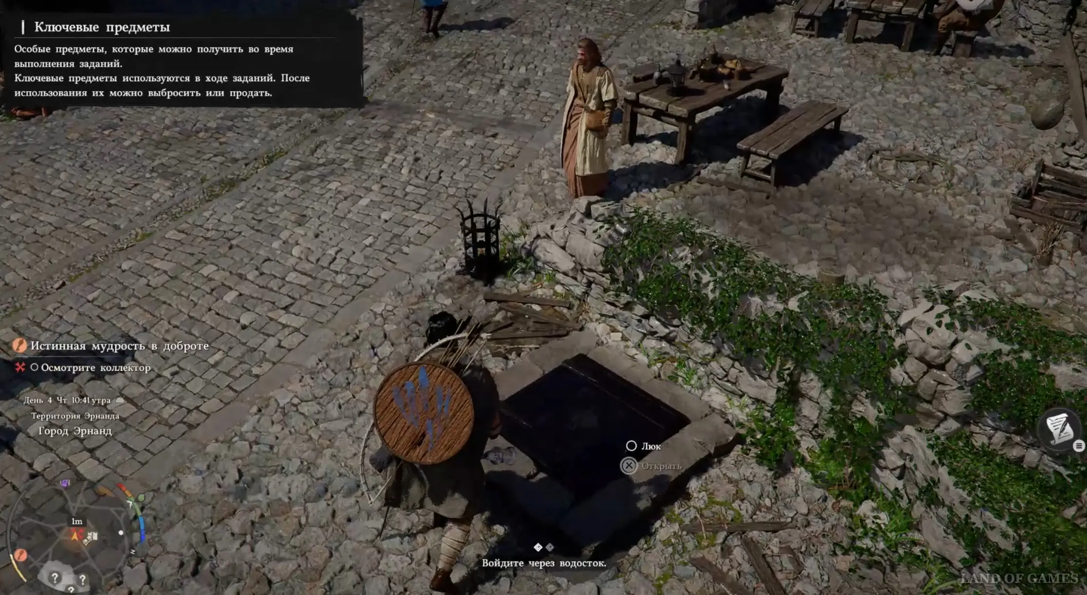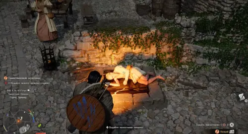 Снова выйдите на улицу, поверните направо и отыщите рядом с каменной оградой нищего старика, лежащего на земле. Наведите на него камеру и подайте ему милостыню. Посмотрите небольшой ролик, после которого вы получите Потертый деревянный ключ от бездомного. Теперь посмотрите вниз, и прямо под ногами вы увидите люк коллектора, который нужно открыть.