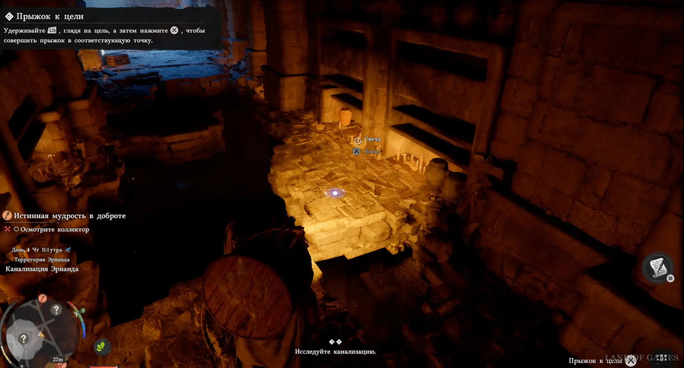 Открыв люк, спуститесь вниз по лестнице в водосток. Повернитесь направо и продолжайте спускаться еще ниже по ступенькам. Идите вперед по туннелю, перепрыгнув на другую сторону по каменным площадкам. Затем подойдите к дворянке и развяжите ее, нажав на «А». Посмотрите еще один ролик, после чего вы получите Запечатанное письмо (сейчас вам не удастся его прочитать).