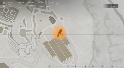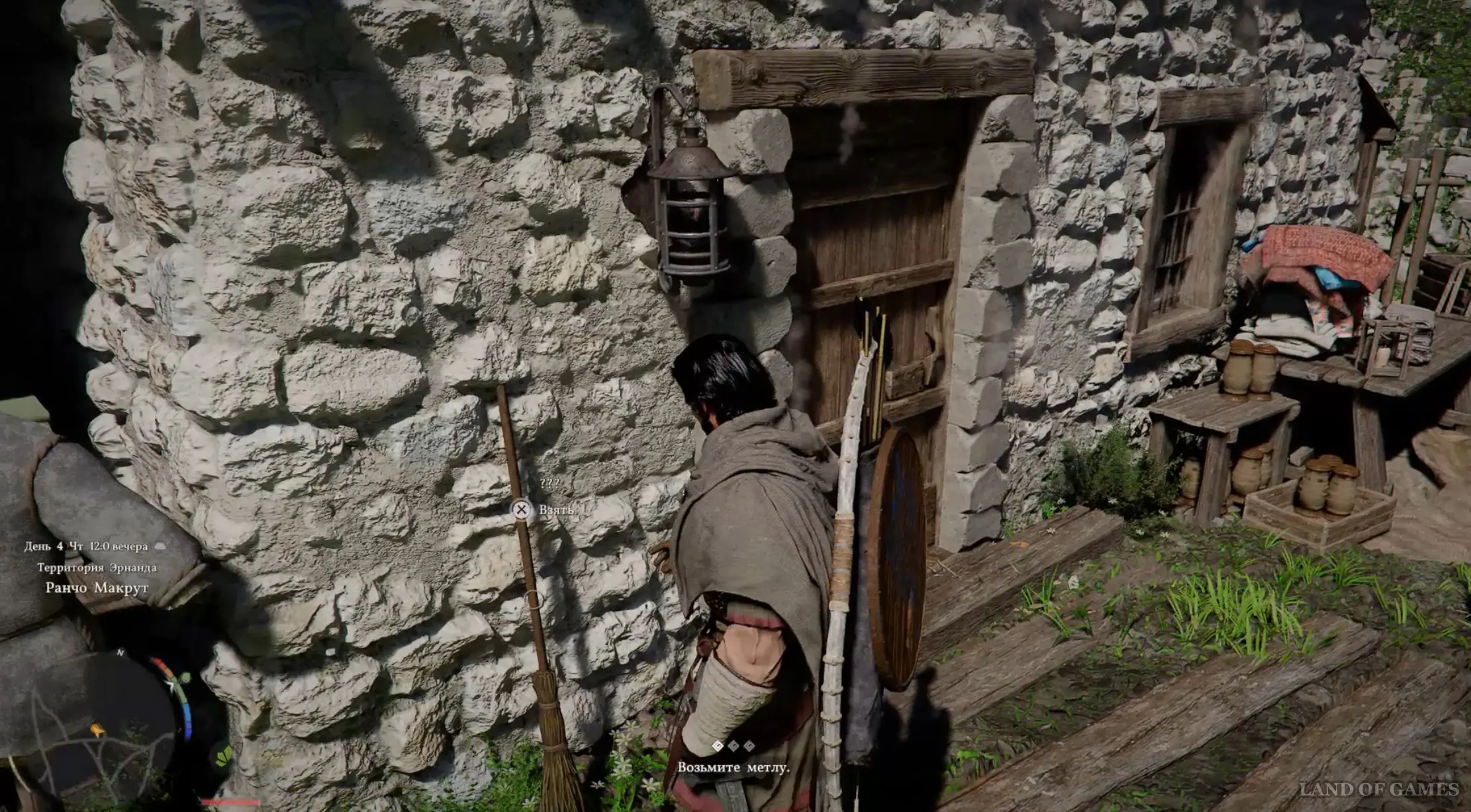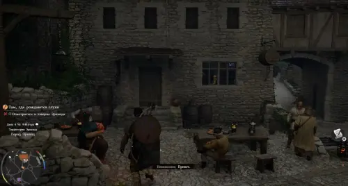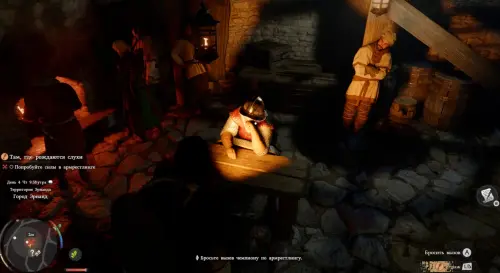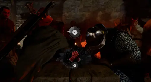 Выйдите из палатки, а затем направляйтесь в таверну Эрнанда, расположенную в северо-западной части города. Войдя внутрь, пройдите в центр помещения и взаимодействуйте со стражником, сидящим за столом (кнопка «А»), чтобы сыграть в армрестлинг. В этой мини-игре вам нужно будет быстро нажимать на «Х», чтобы окрасить всю шкалу в красный цвет.