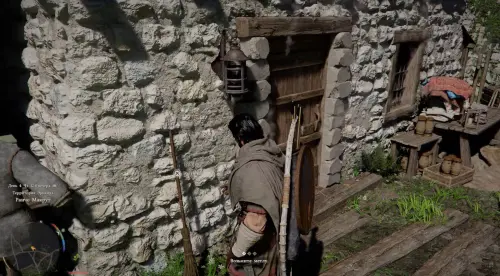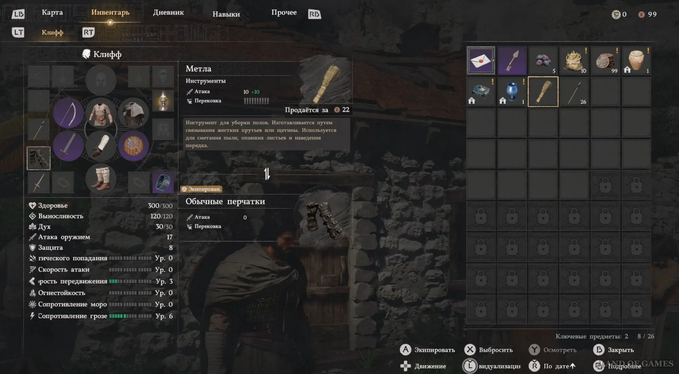 Идите за пределы города и дойдите до дома портного. Вы увидите, как мужчина сваливается с крыши при попытке прочистить дымоход, а его жена будет очень зла. Согласитесь помочь семейной паре и возьмите метлу, прислоненную к стене домика. Затем откройте инвентарь, найдите в нем метлу и экипируйте ее.