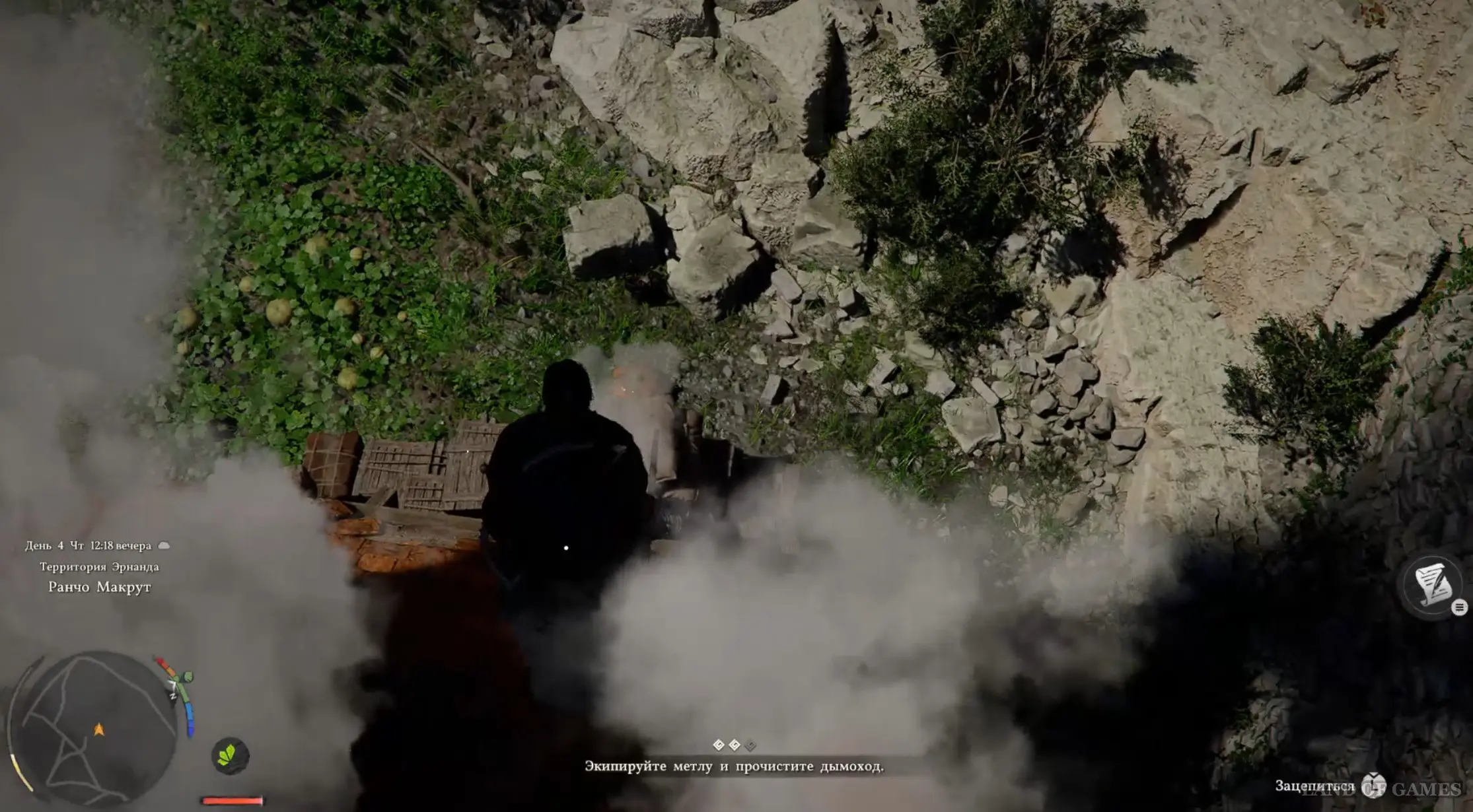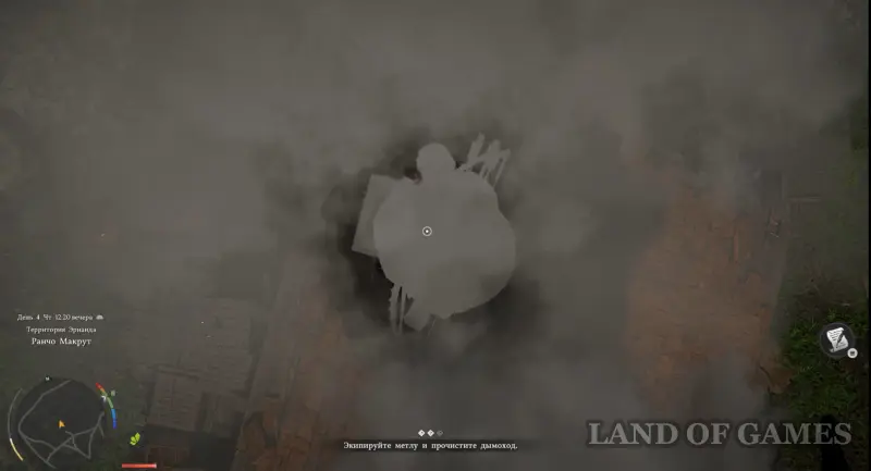 Нажмите кнопку «влево» на D-Pad для вызова панели быстрого действия и выберите здесь метлу, чтобы взять ее в руки. Далее заберитесь на крышу дома, залезьте прямиком на дымоход, нажмите LB и начните чистить трубу от сажи. Гляньте новый ролик, после чего задача будет считаться выполненной.