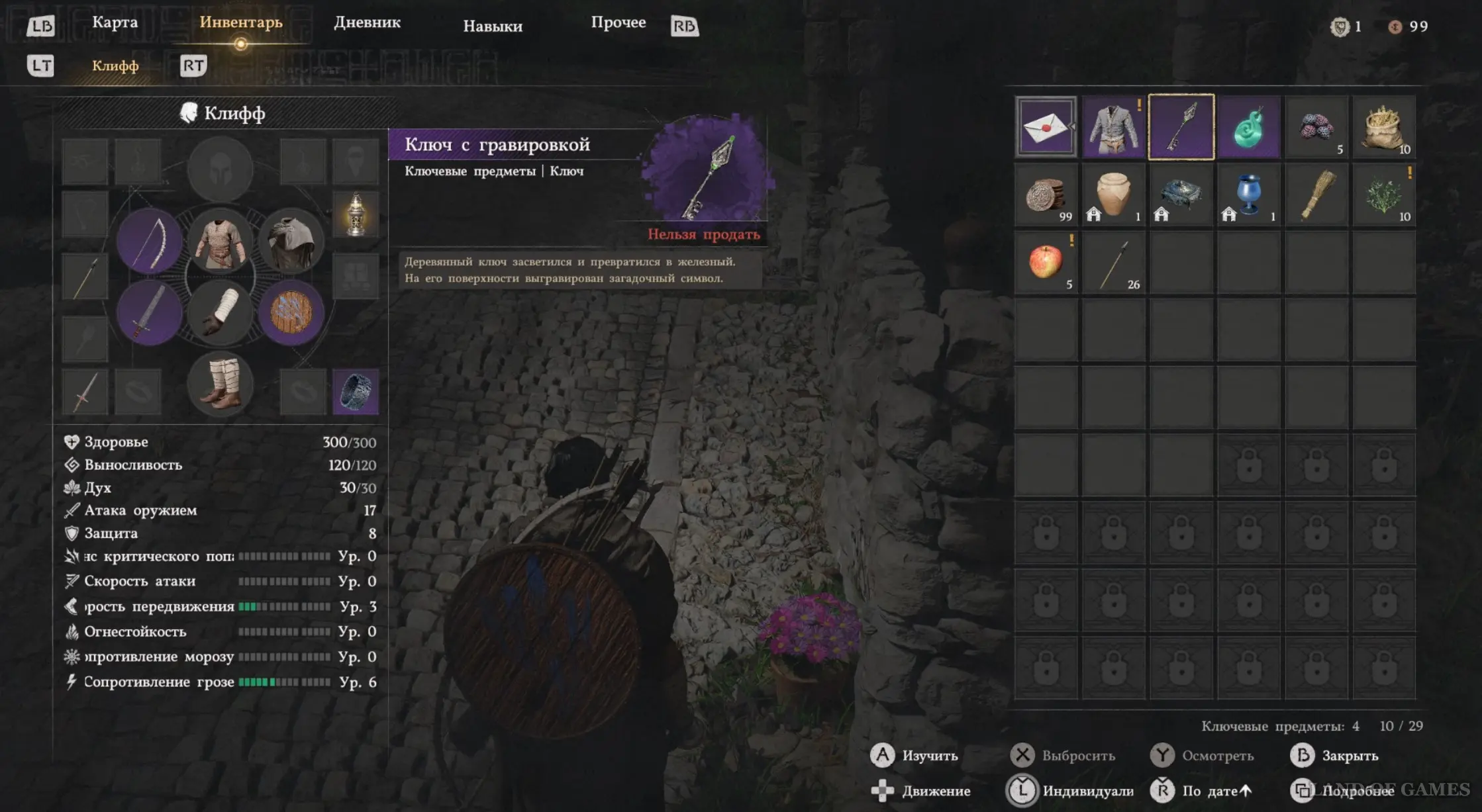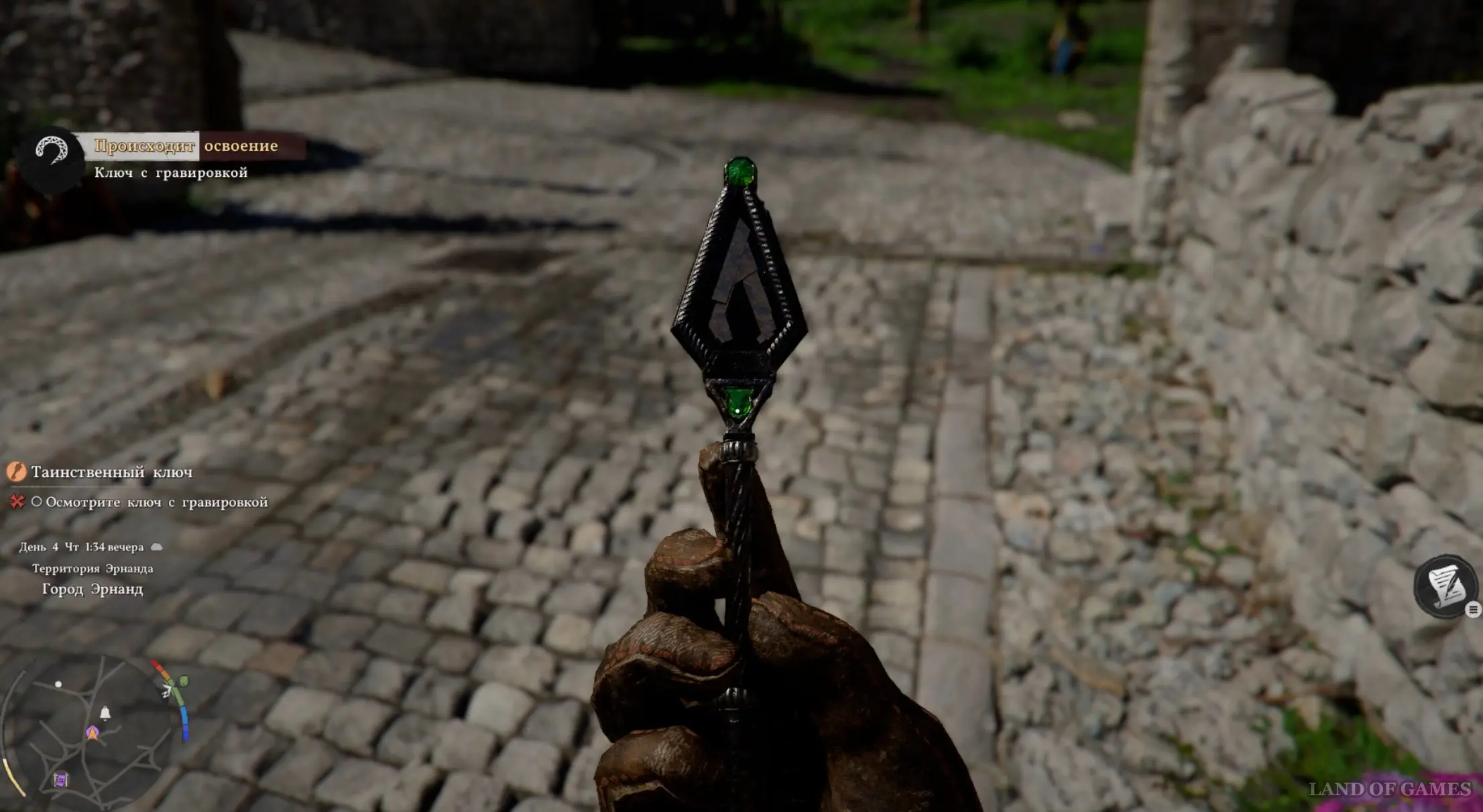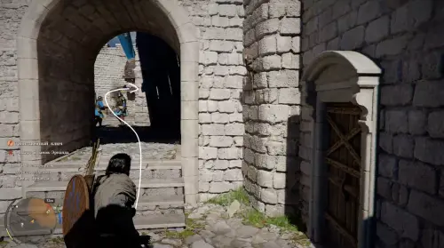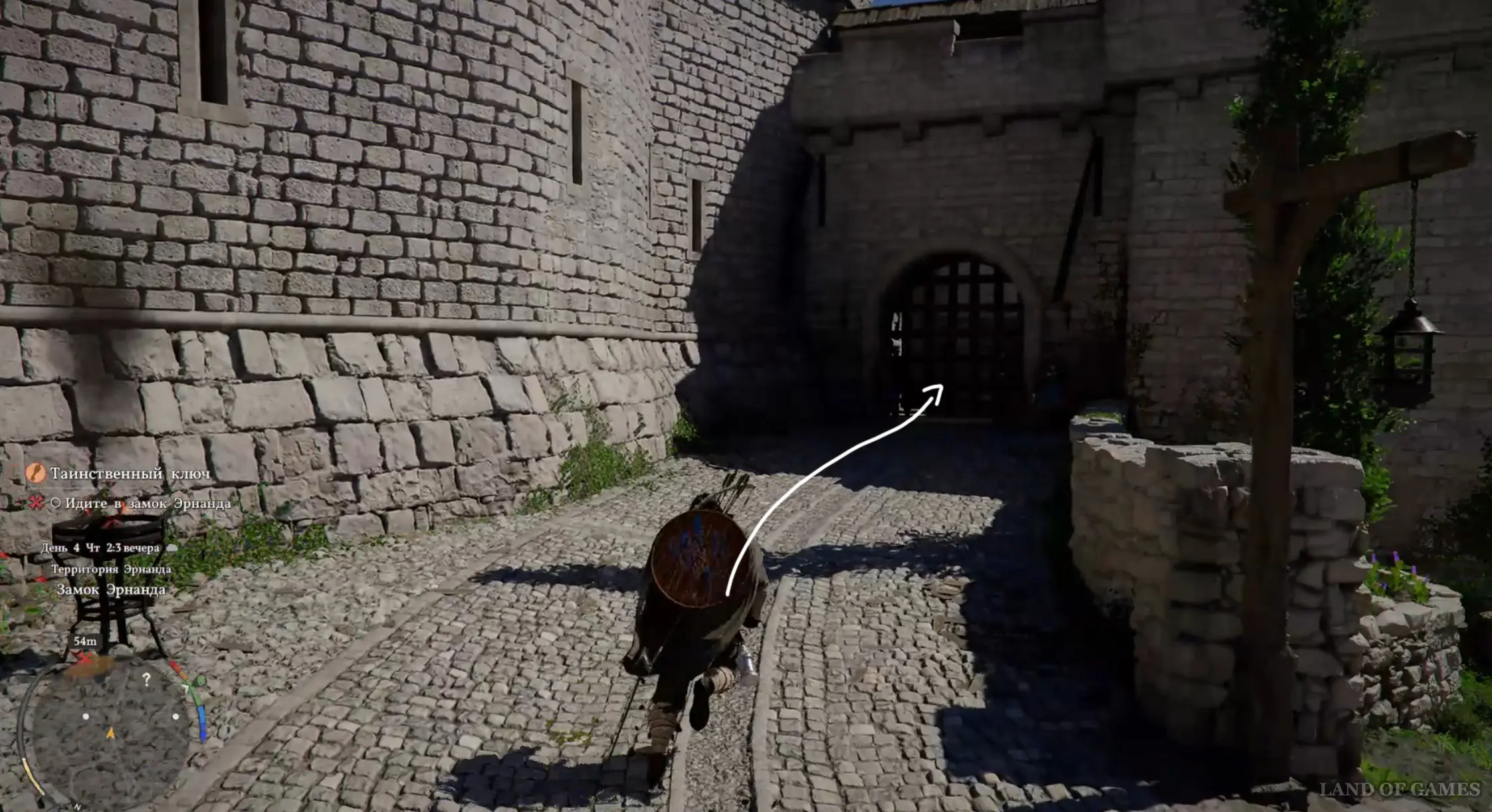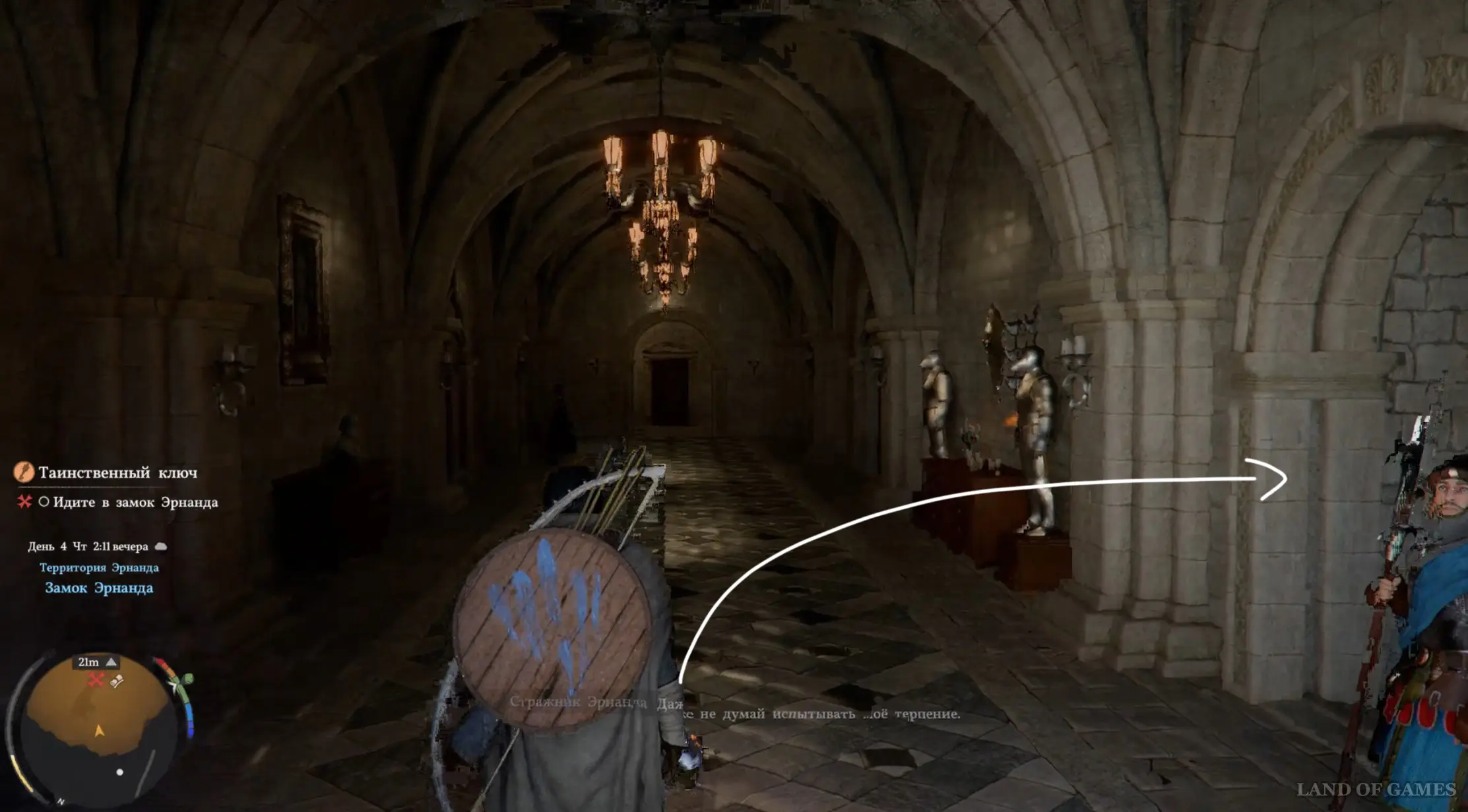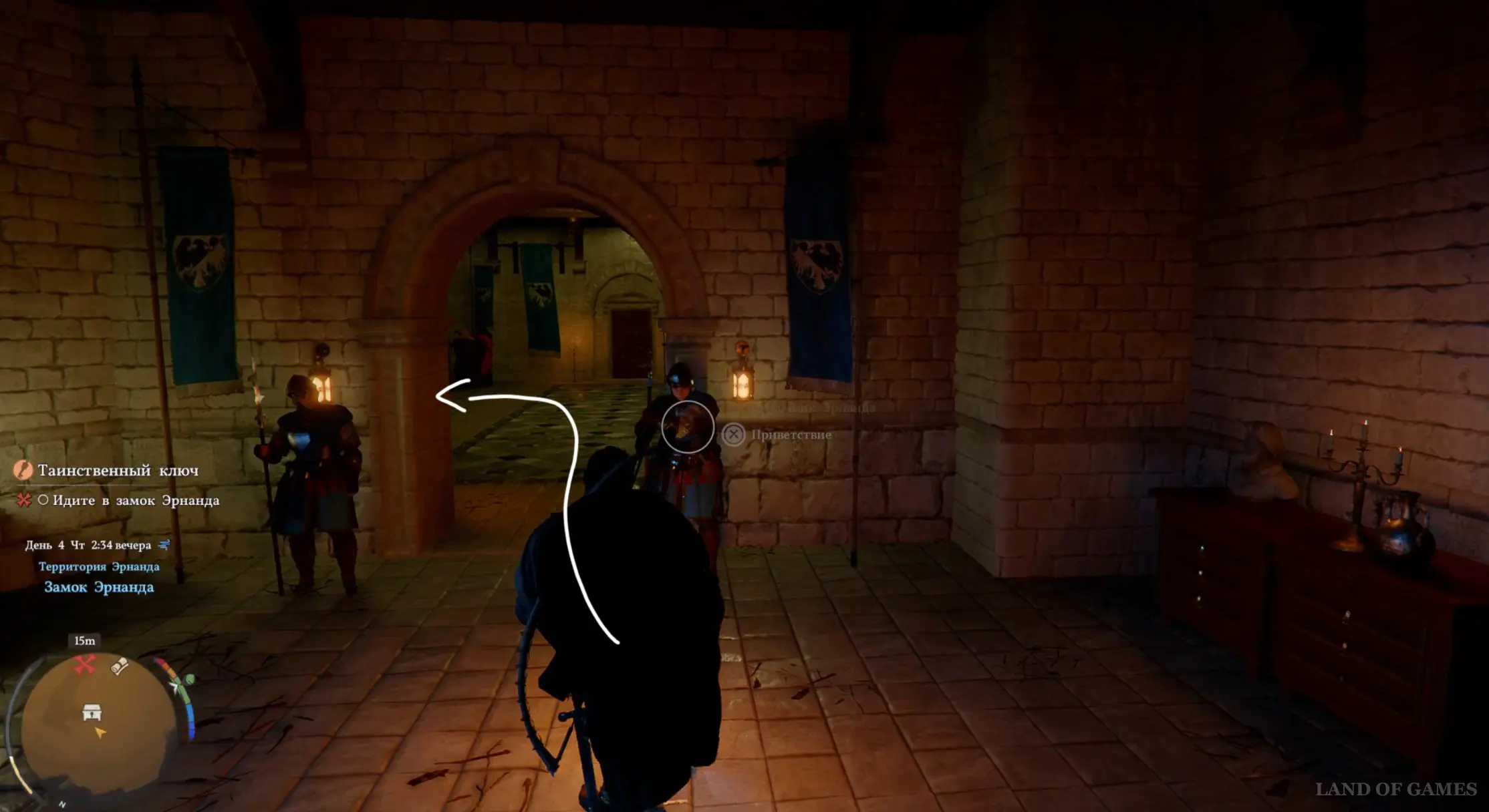 Гляньте новый ролик, а потом подберите Кулон шай с земли. Теперь откройте инвентарь, выберите Ключ с гравировкой и начните его изучение, зажав LB. Вы узнаете, что нужная вам замочная скважина находится в замке Эрнанда. Начните идти на север и подойдите к запертым воротам, однако вас тут же остановят стражники.