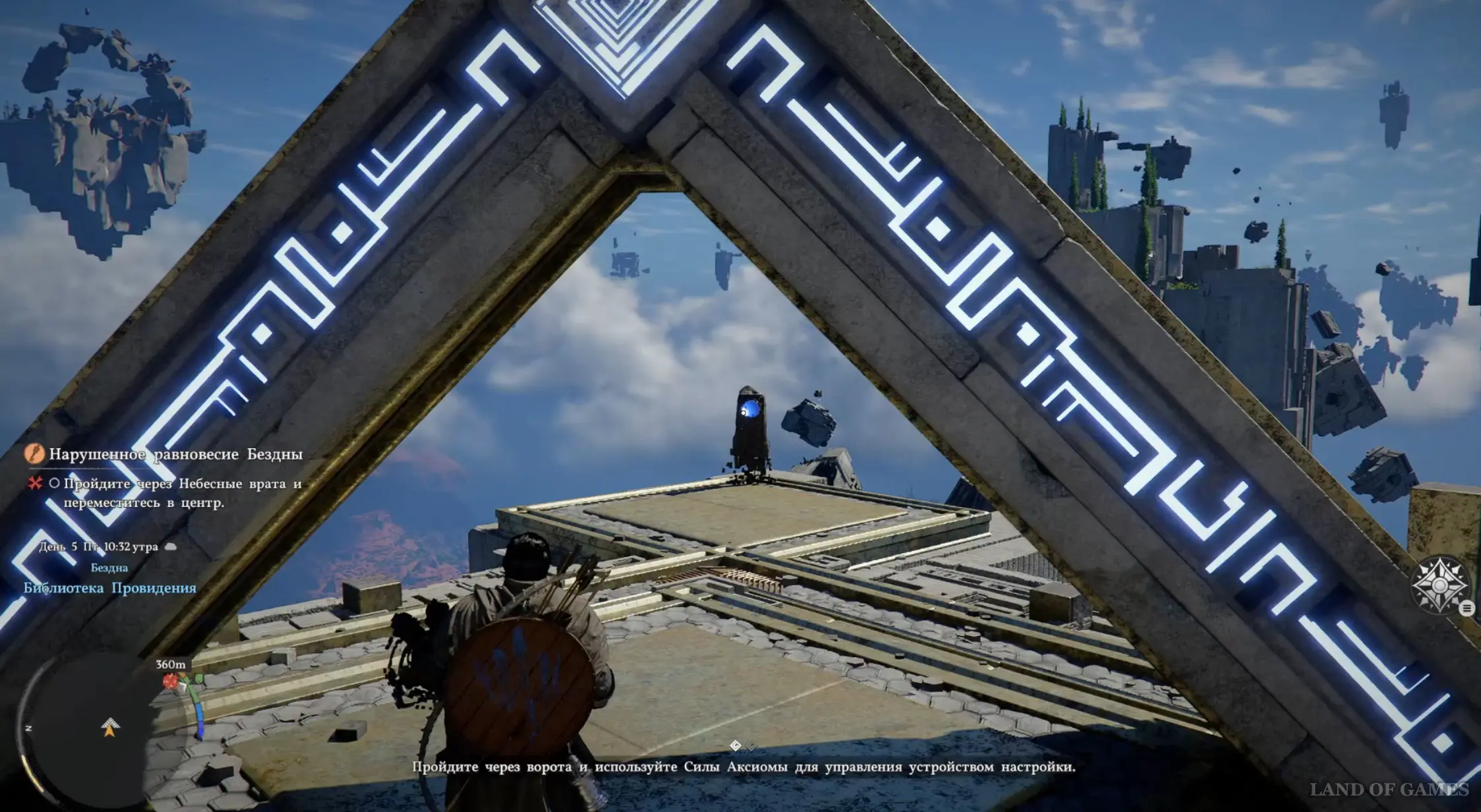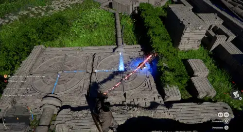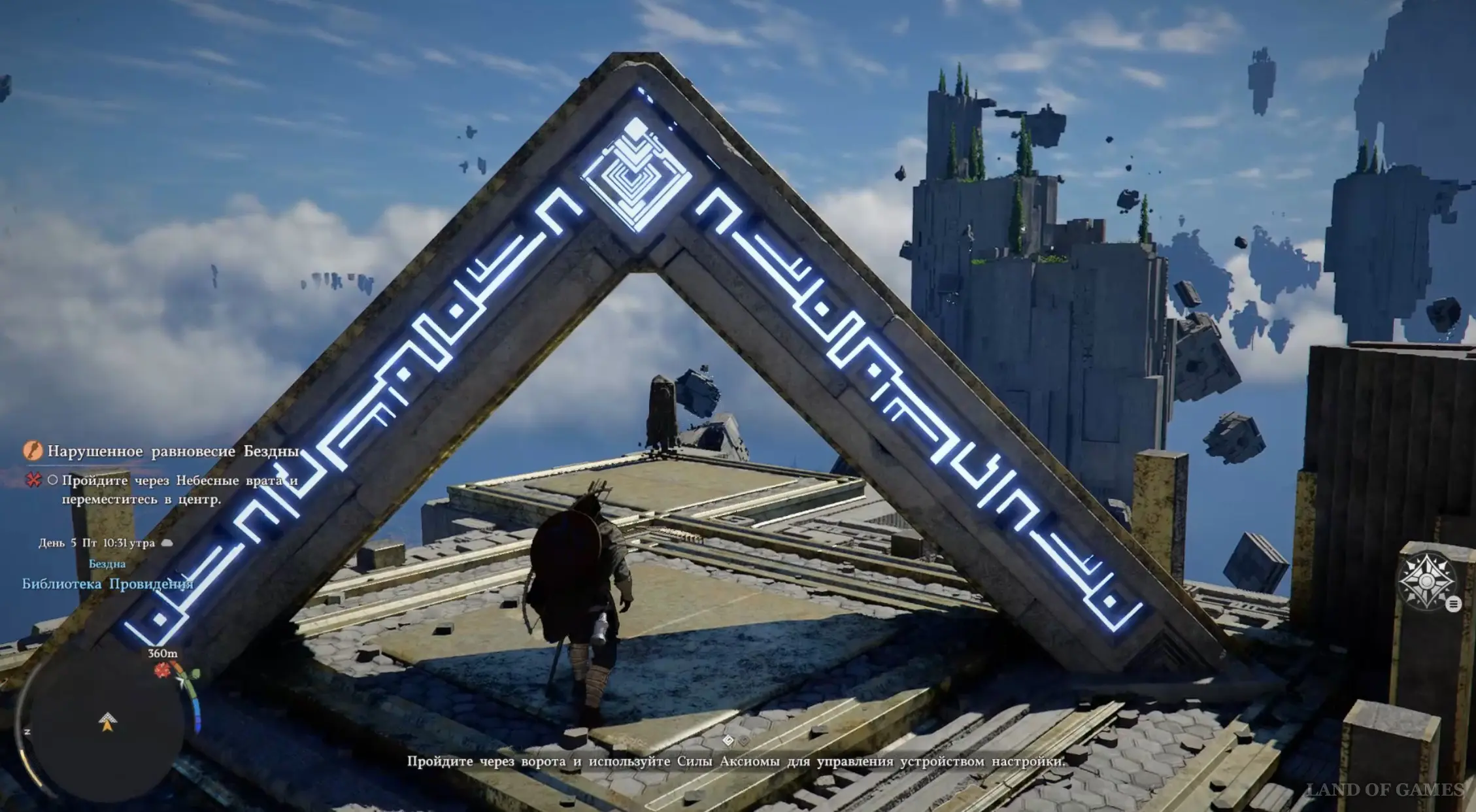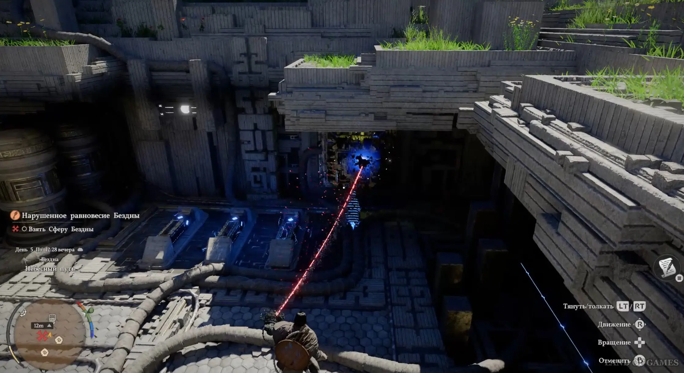 Оказавшись в новой локации, двигайтесь вперед и встаньте на платформу, чтобы активировать Средоточие Бездны (местный аналог телепорта). Бегите к зданию и получите силу Аксиомы от белой птицы. Затем пройдите к двум каменным плитам чуть позади и используйте на правой силу Аксиомы, надавив на левый стик.