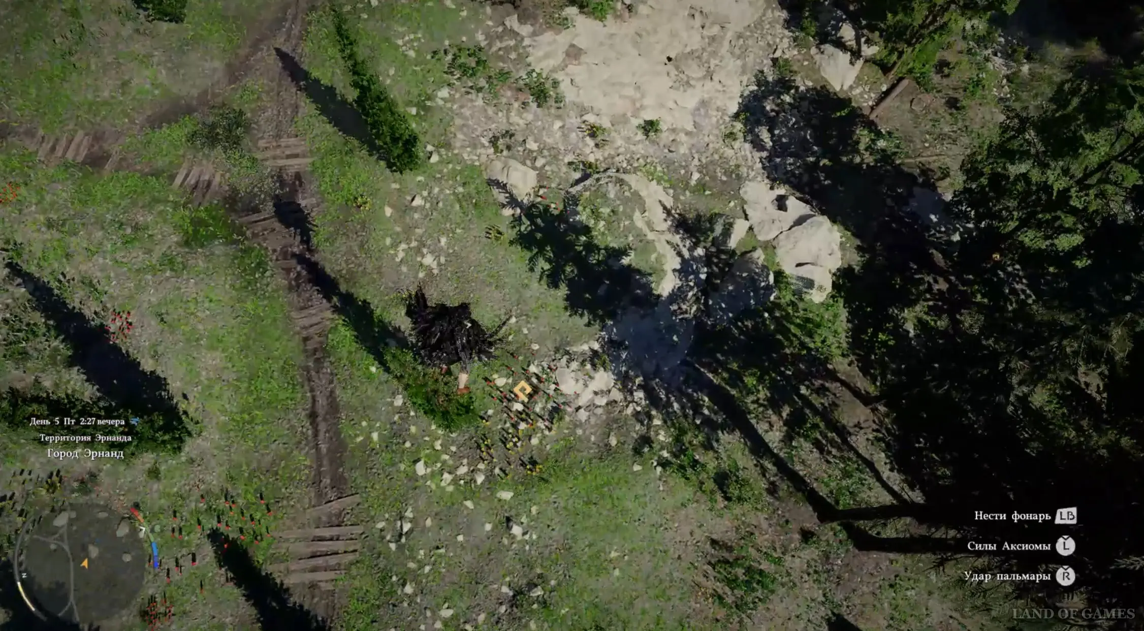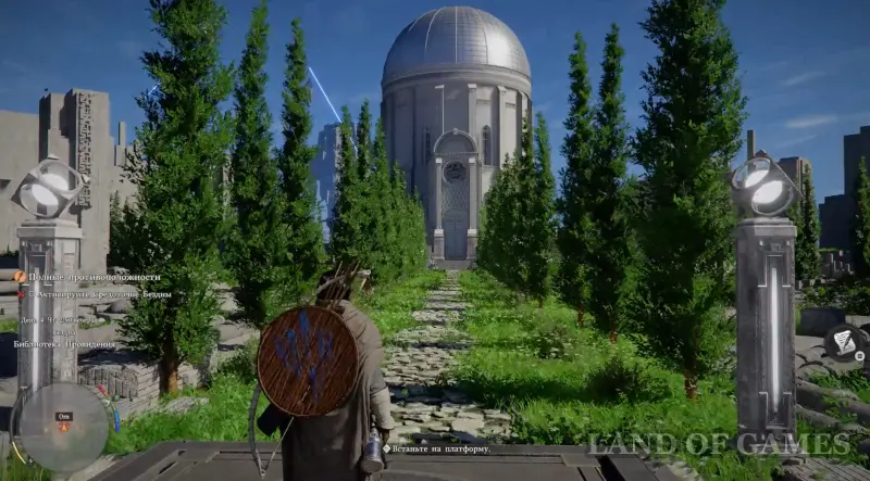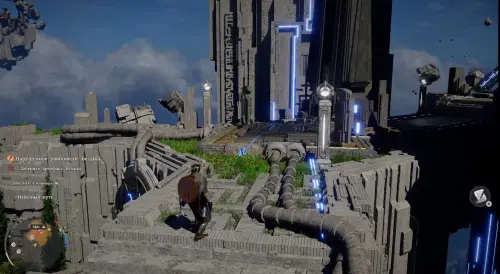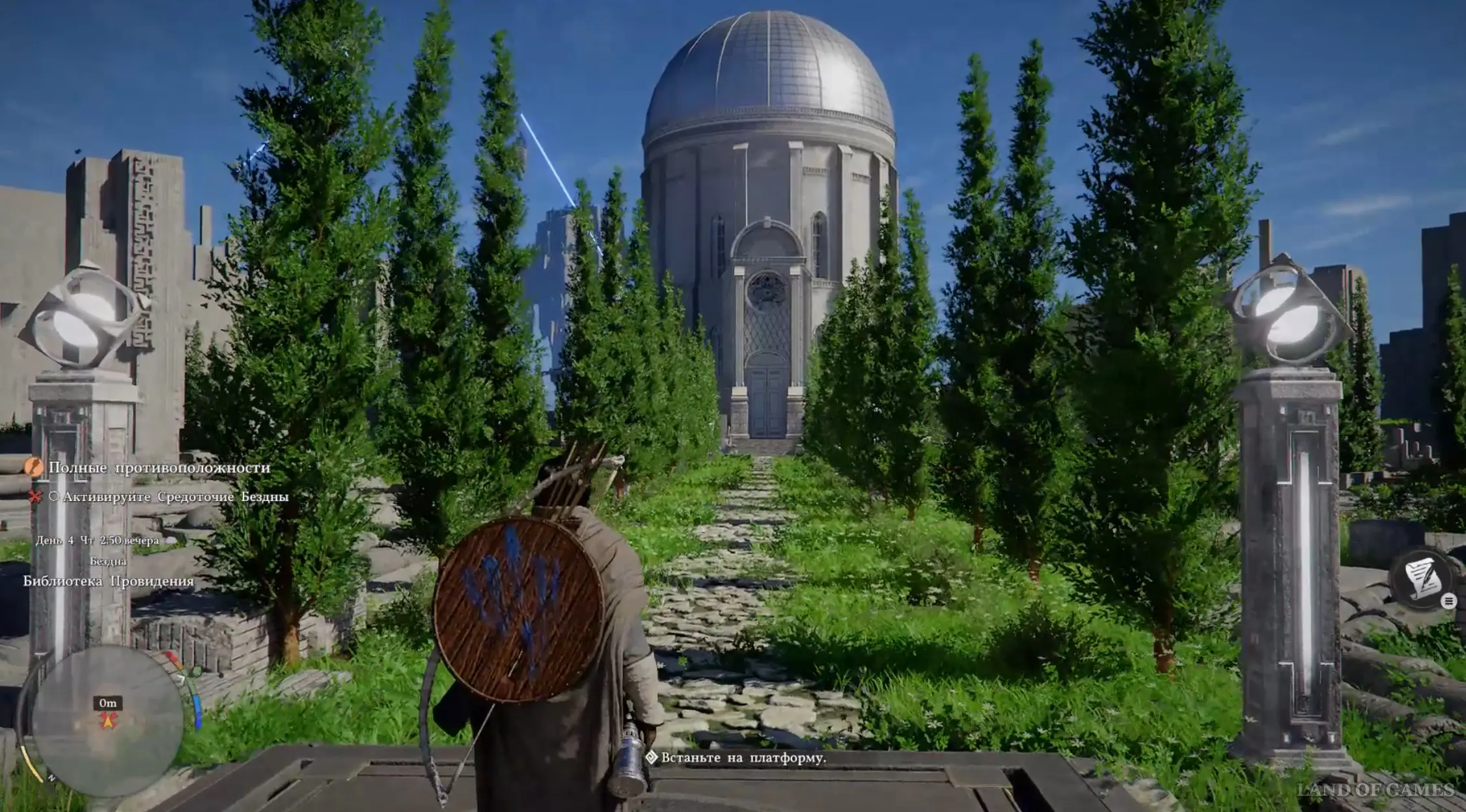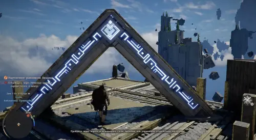 Оказавшись в новой локации, двигайтесь вперед и встаньте на платформу, чтобы активировать Средоточие Бездны (местный аналог телепорта). Бегите к зданию и получите силу Аксиомы от белой птицы. Затем пройдите к двум каменным плитам чуть позади и используйте на правой силу Аксиомы, надавив на левый стик.