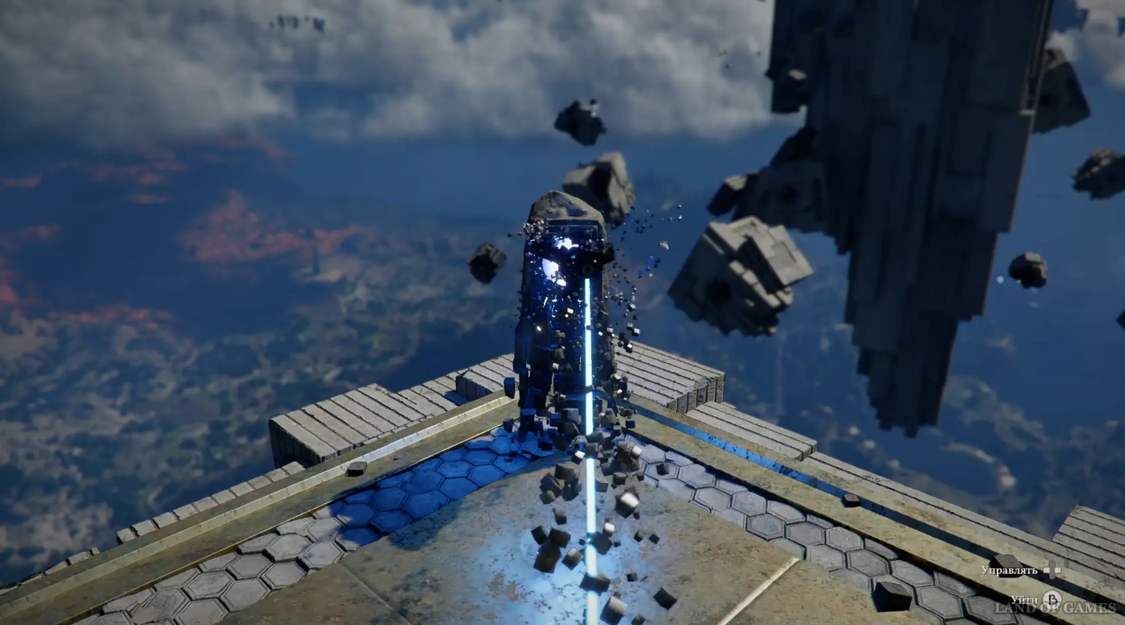 Впереди возникнет дорожка из парящих платформ – начните прыгать по ним вперед, двигаясь к центру области. Не забывайте, что вы можете осуществлять прыжки к цели, то есть удерживать LB, наводить прицел на выступ и осуществлять прыжок. Это позволит вам без проблем дотянуться до любых площадок.