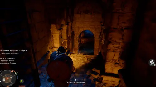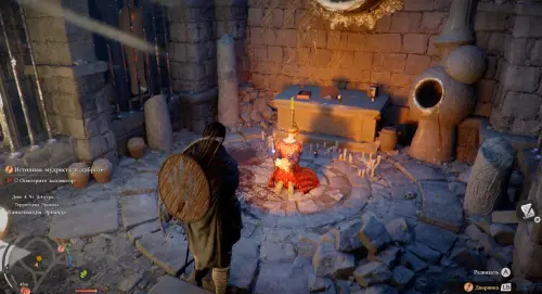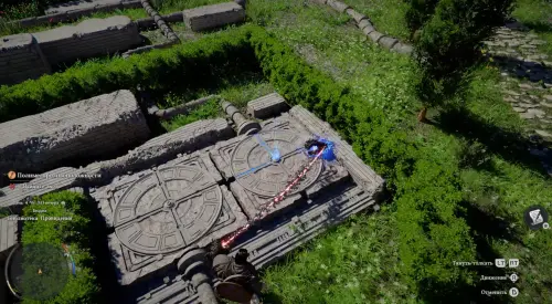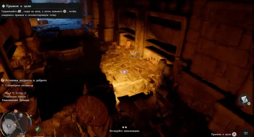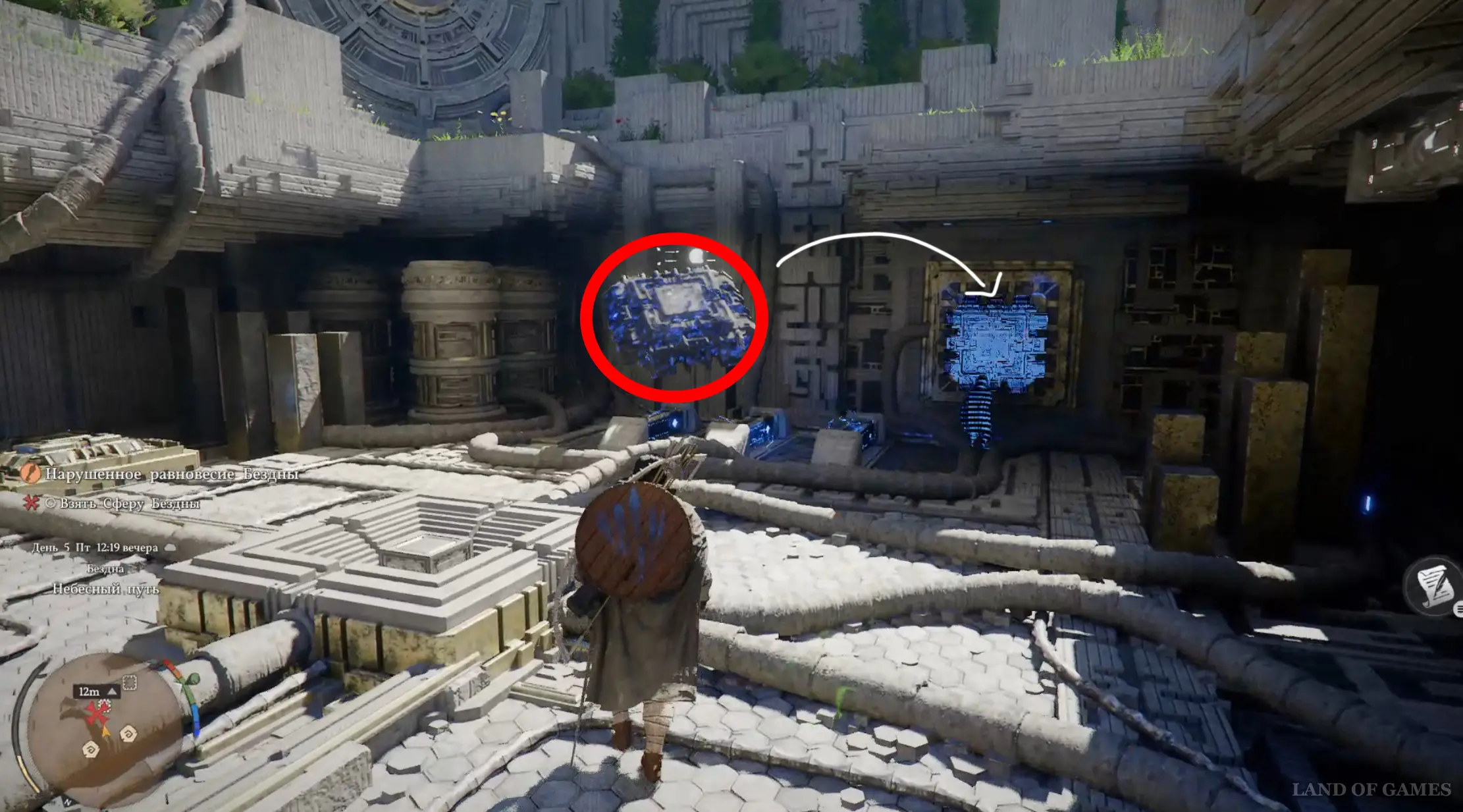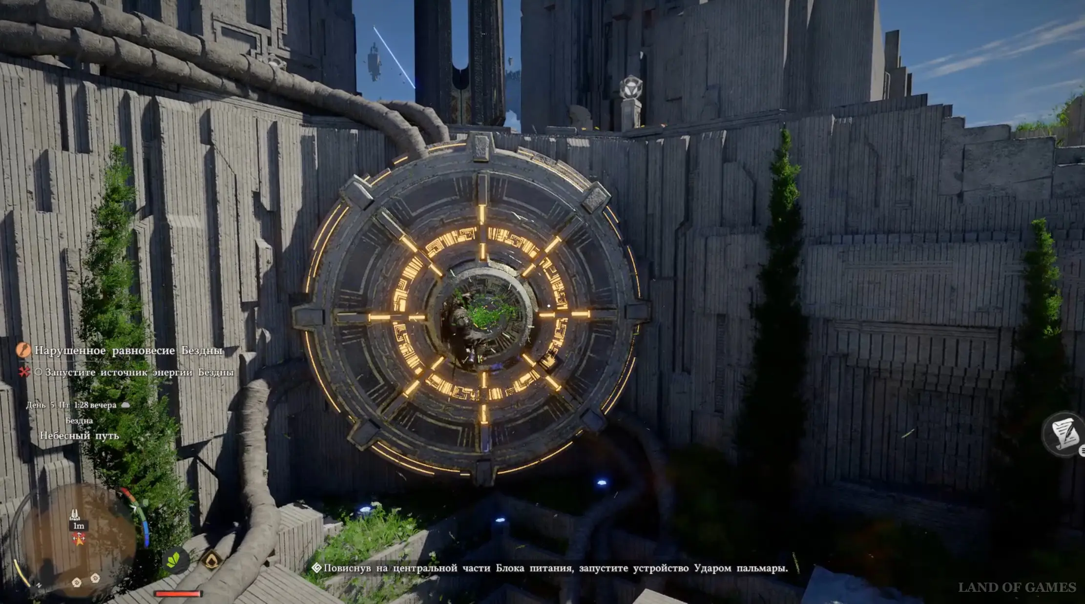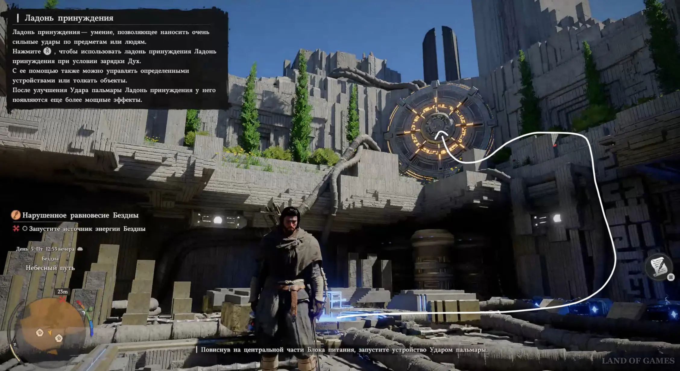 После этого в центре активируется энергетическая система. Выберитесь из ямы и залезьте на светящийся каменный круг наверху. Зацепитесь за его центр, а потом снова надавите на правый стик, чтобы применить Ладонь принуждения и стукнуть по выпуклой части устройства. Тем самым вы сможете запитать энергией всю систему.