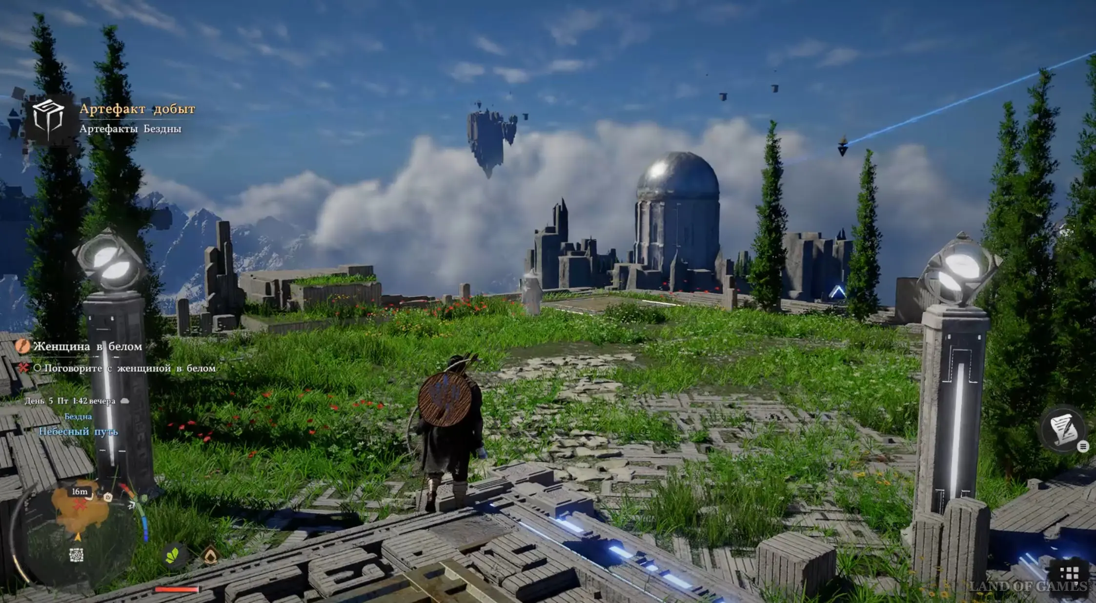 Теперь заберитесь наверх и схватите артефакт Бездны, парящий неподалеку. Начнется новая кат-сцена с появлением белой птицы, которая превратится в женщину. Подойдите к ней и поговорите. Она назовет себя Белой вороной и скажет, что является стражницей Бездны и защитницей космического порядка.