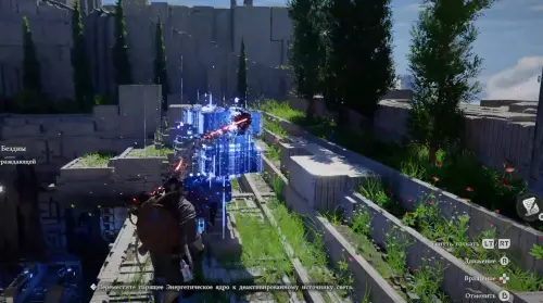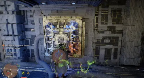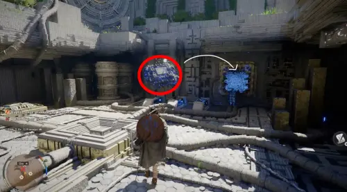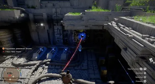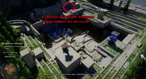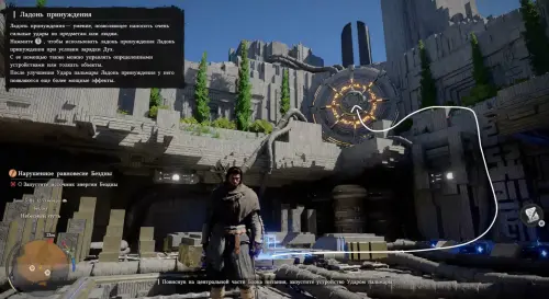 Оказавшись внизу, схватите парящую в воздухе деталь силой Аксиомы и поднесите ее к пустой ячейке справа. Затем подойдите к ней и освойте навык «Ладонь принуждения» (нужно просто постоять немного рядом). Далее надавите на правый стик и ударьте кулаком по парящей детали, чтобы вставить ее в паз.