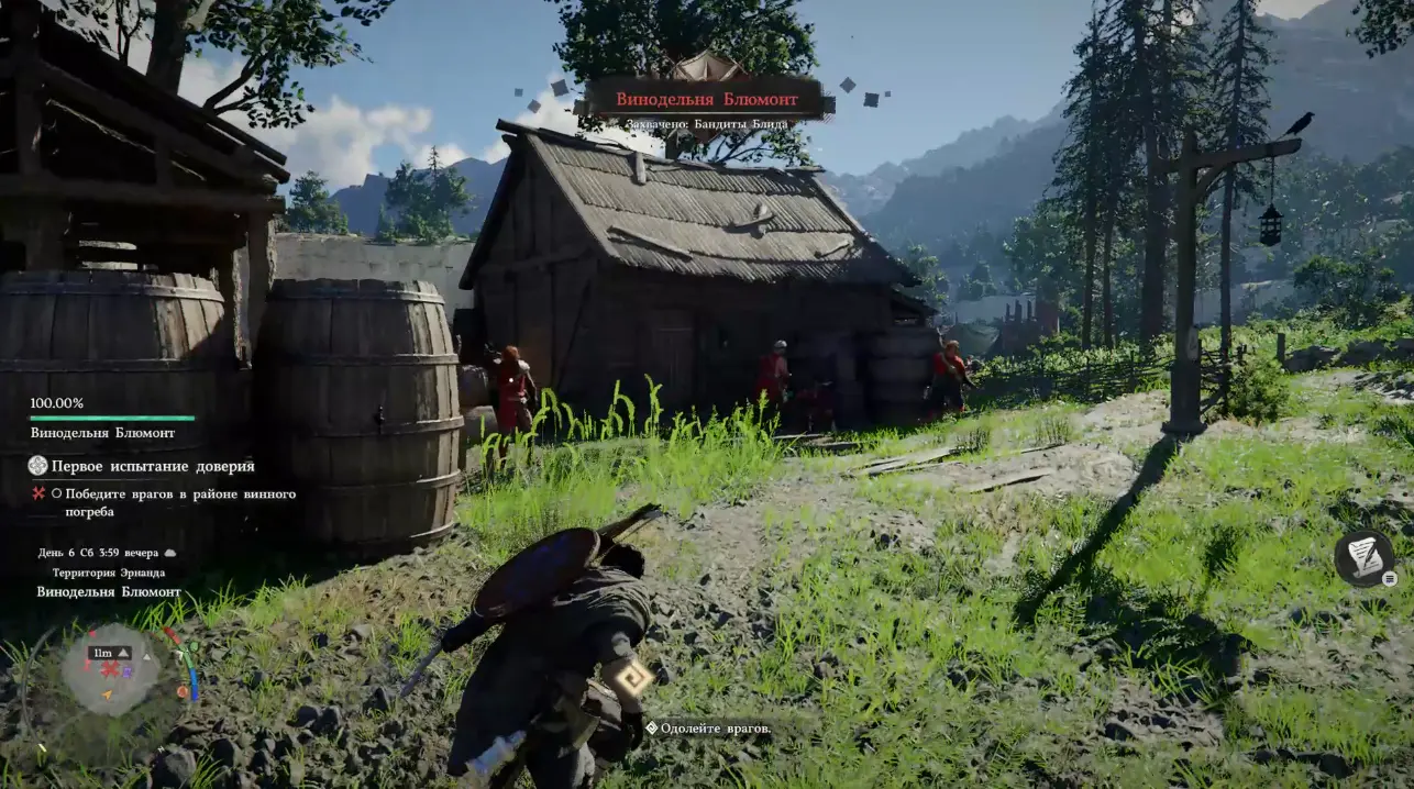 Винный погреб расположен еще ниже от Ранчо Макрут, на территории Винодельни Блюмонт. Отыскать воров не составит труда, они засели у небольшого дома, окруженного бочками с вином и все одеты в красное.