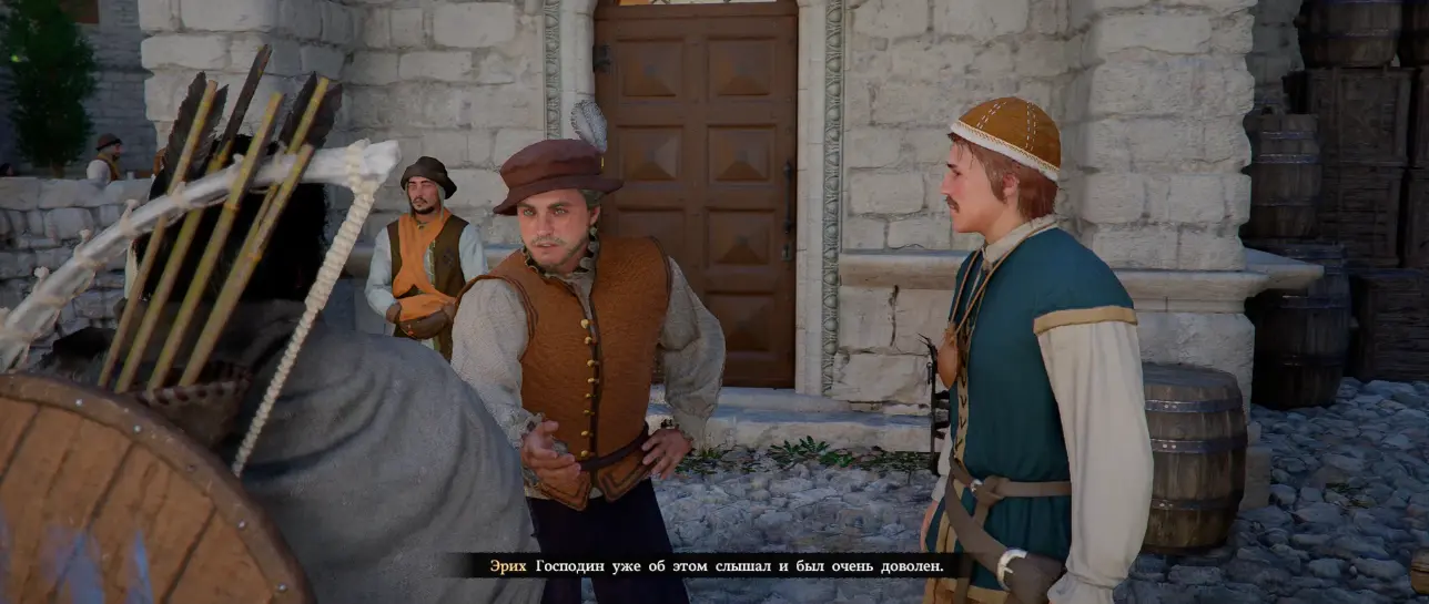 Мужчину зовут Эрих и он вкратце объяснит, что в поместье постоянно пробираются воры, а охрана ничего не может сделать. Также управляющий даст нам наводку откуда начать поиски бандитов – винный склад.