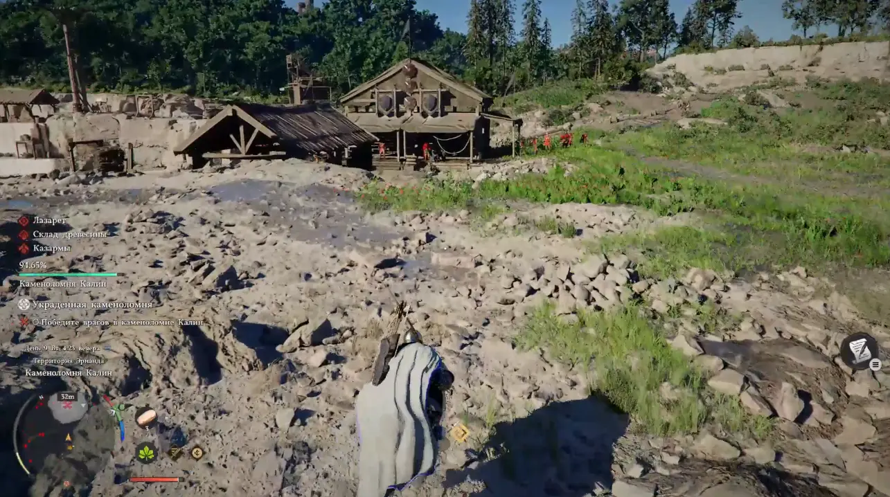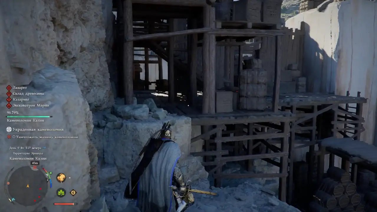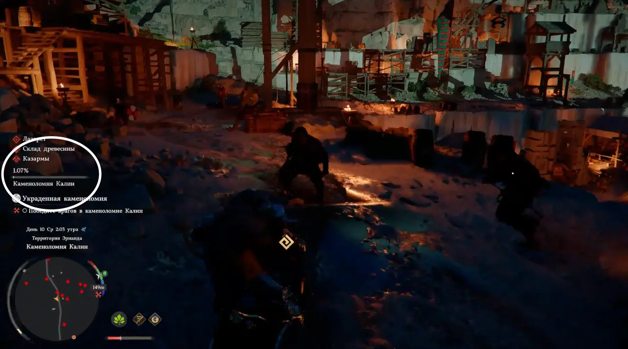 Прибыв на каменоломню, вы сразу же встретите врагов, убить их придется немало. Механика зачистки может работать по нескольким сценариям. Локация разделена на отдельные участки: Лазарет, Склад древесины, Казармы и Экскаватрон Марни, которые можно постепенно отбивать у бандитов, тем самым ускоряя снижение общей шкалы контроля. Однако этот способ не всегда срабатывает стабильно, поэтому полагаться только на него не стоит.