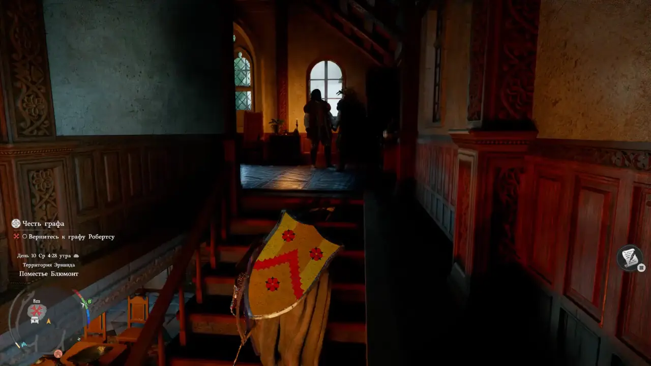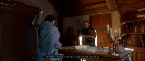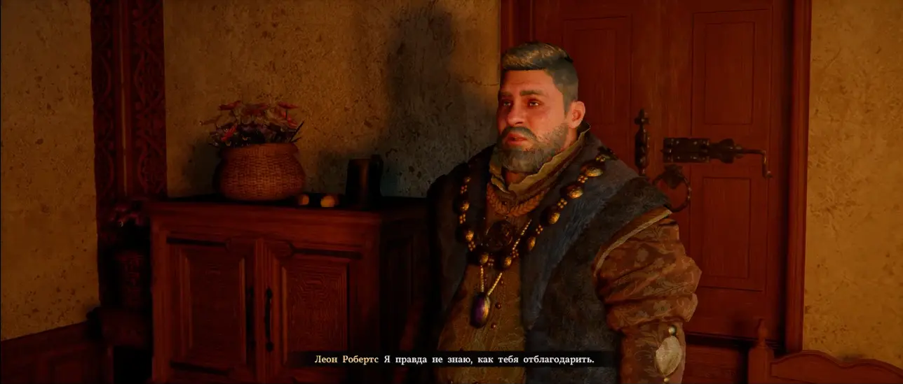 У входа вас встретит мажордом Эрих, который общается с другим мужчиной, – взаимодействуйте с ним. Управляющий отметит заслуги Клиффа и будет готов отвести вас к графу Робертсу.