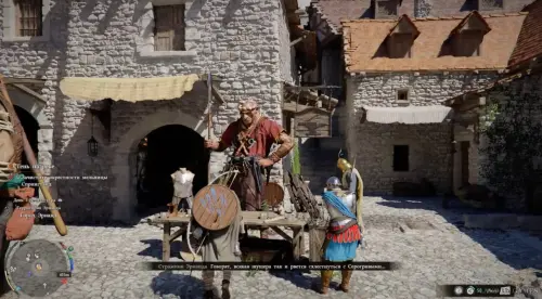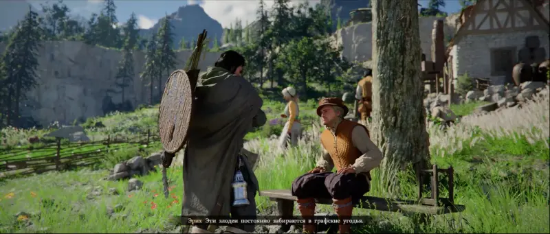 Среди играющих детей и работающих взрослых сильно выделяется мужчина в головном уборе с пером, который грустно сидит на скамейке. Взаимодействуйте с ним, чтобы начать диалог.