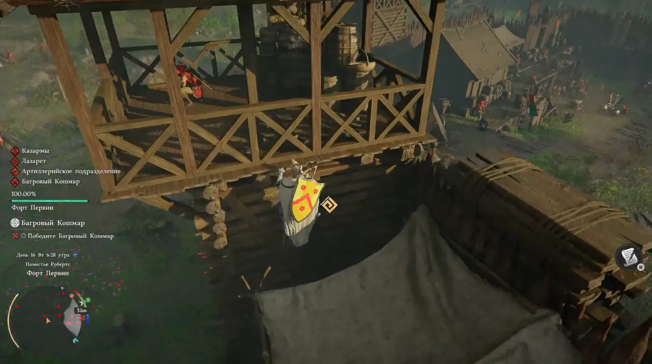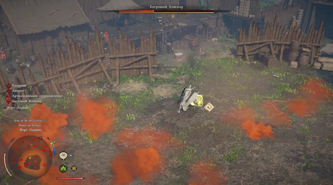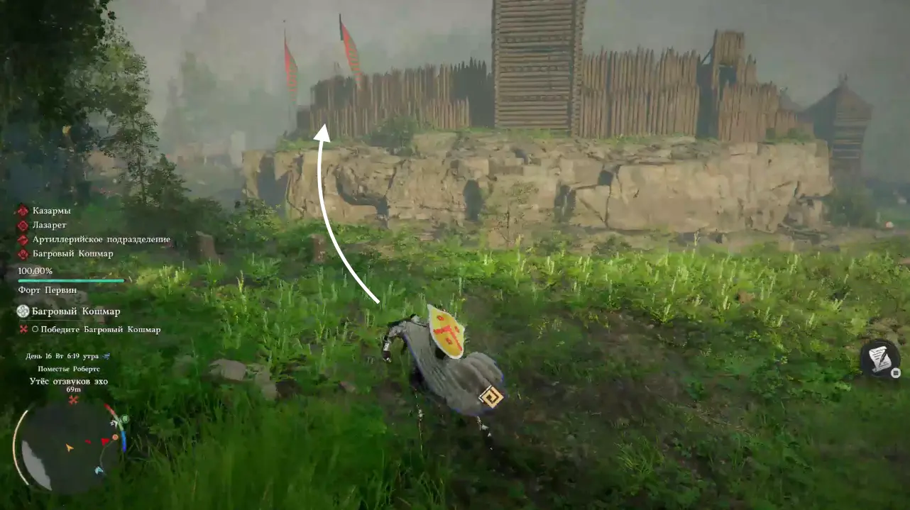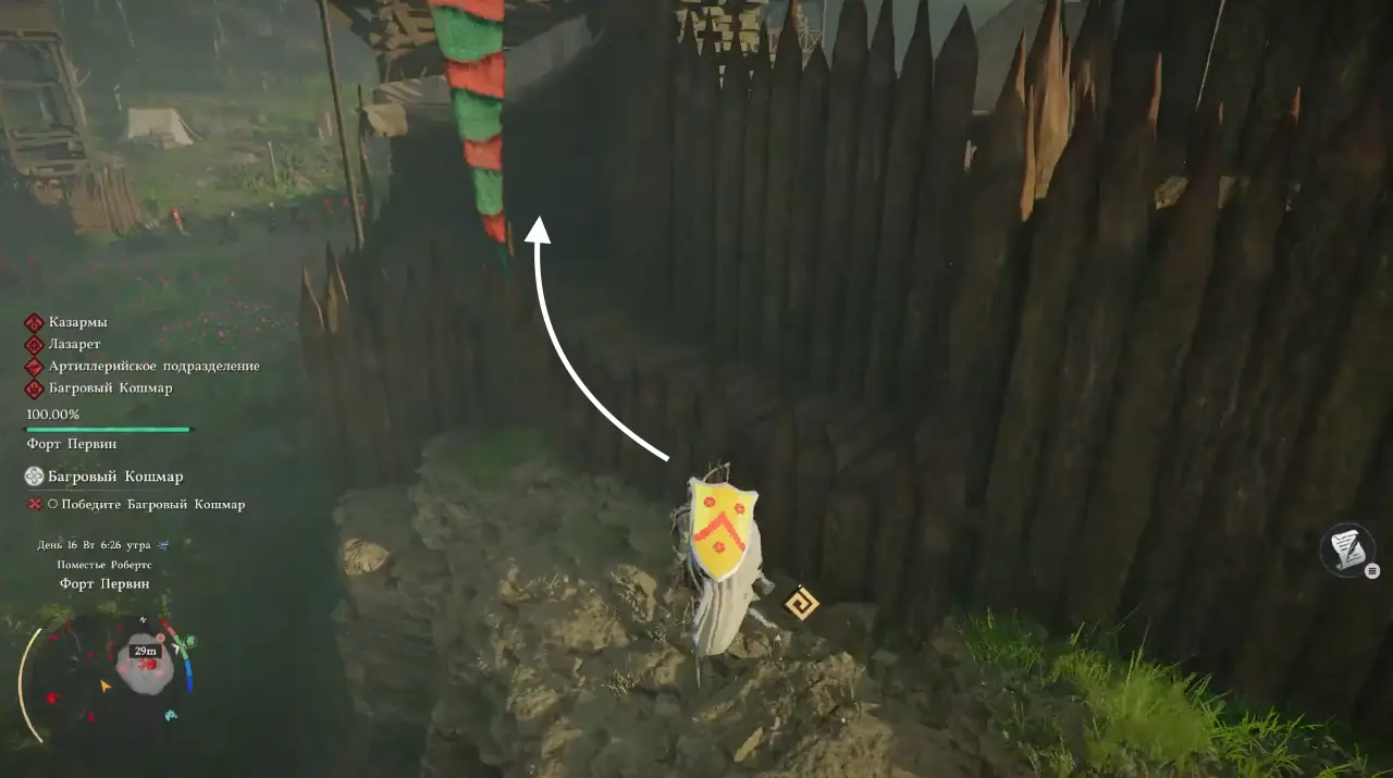 Подойдя к форту, вы можете обойти его с левой стороны, там есть участок частокола, через который можно перелезть и попасть прямо на арену с боссом. Однако спешить к нему не стоит. Более разумно сначала зачистить сам форт. Это избавит вас от лишних противников во время финального боя и не заставит сражаться с ними уже после победы над боссом, когда ресурсы могут быть на исходе.