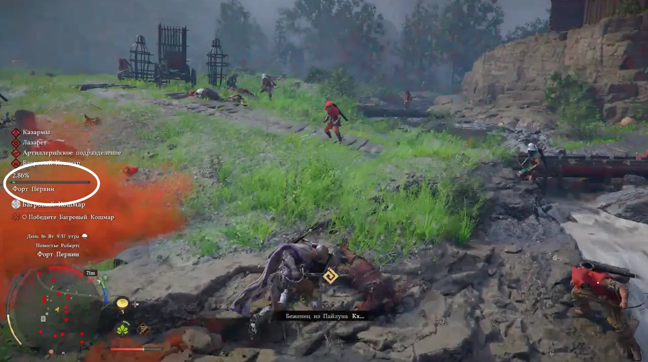 Механика зачистки здесь схожа с каменоломней: шкала снижается по мере устранения врагов. В отличие от карьера, для полного контроля над фортом потребуется уничтожить заметно меньше противников, примерно 90, после чего территория будет считаться освобожденной и можно будет сосредоточиться на основной цели.