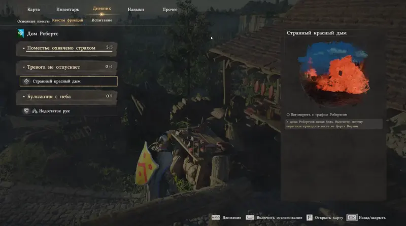 Набор миссий «Тревога не отпускает» состоит из 4 заданий и входит в квесты фракций – задания дома Робертс. Первое задание «Странный красный дым» связано с новой бедой, произошедшей в доме графа Робертса, отправляйтесь в его поместье в Эрнанде, чтобы узнать подробности.