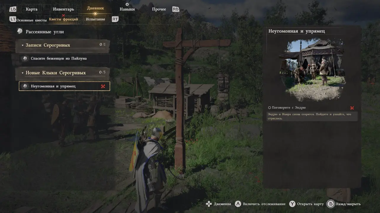 Далее цепочку можно начать во вкладке Дневник – Квесты фракций – Рассеянные угли. Она делится на 3 задачи, которые проходятся поэтапно. Чтобы запустить первое задание из всей цепочки, отправляйтесь на Волчий холм в локации Поместье Серкис.