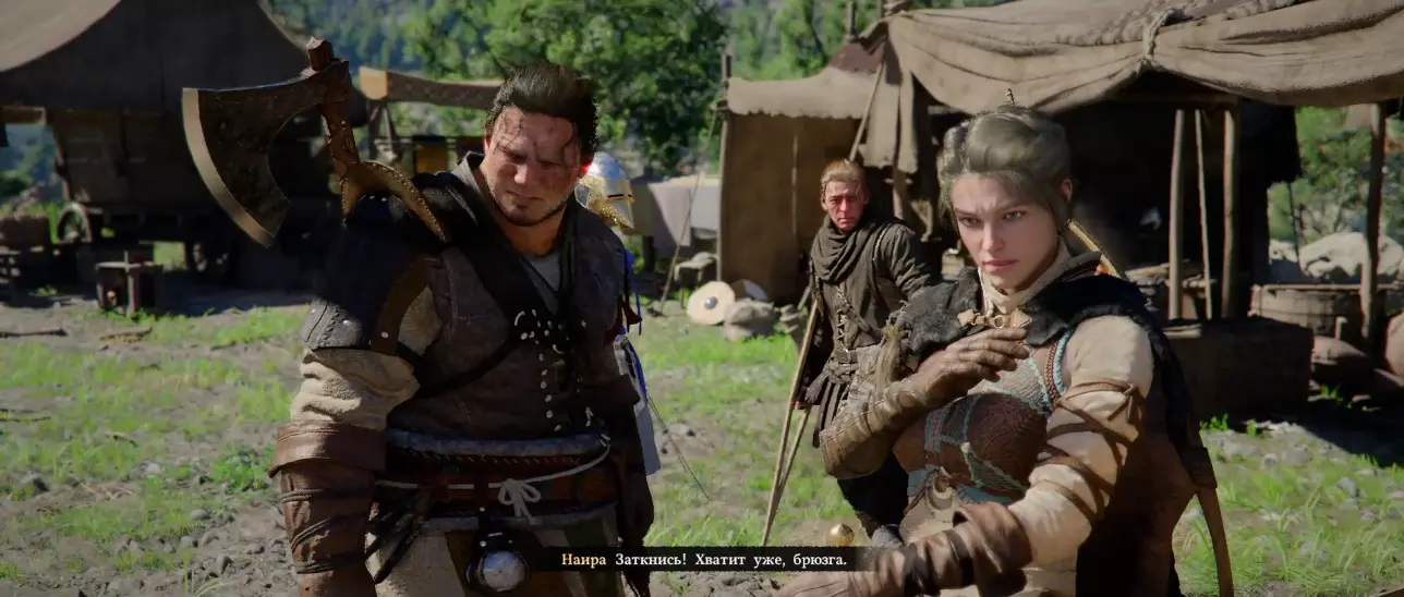 Едва вы начнете приближаться к маркеру задания, то начнете замечать деревянные постройки и палатки. Чтобы найти нужного NPC, найдите самую богатую по виду палатку: она черная, с небольшими коричневыми вставками. Слева от нее стоит Эндрю, который о чем-то активно спорит с Наирой. Взаимодействуйте с ними, чтобы узнать причину конфликта.