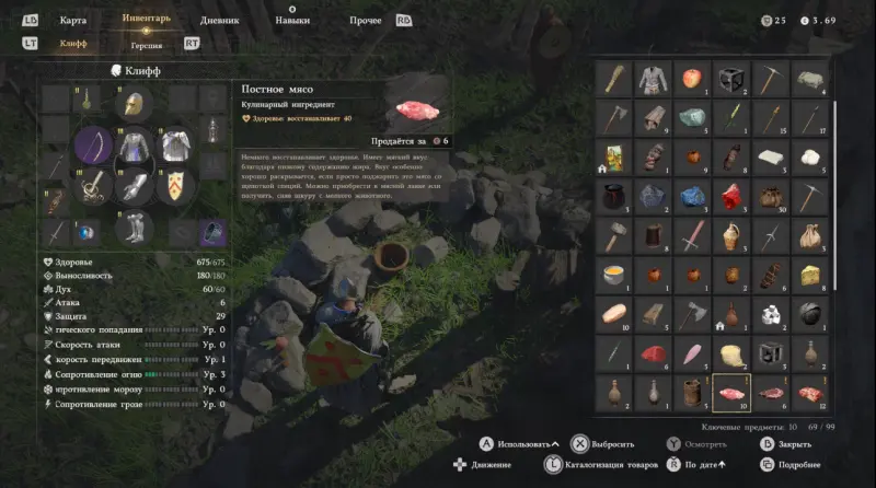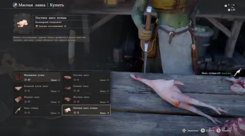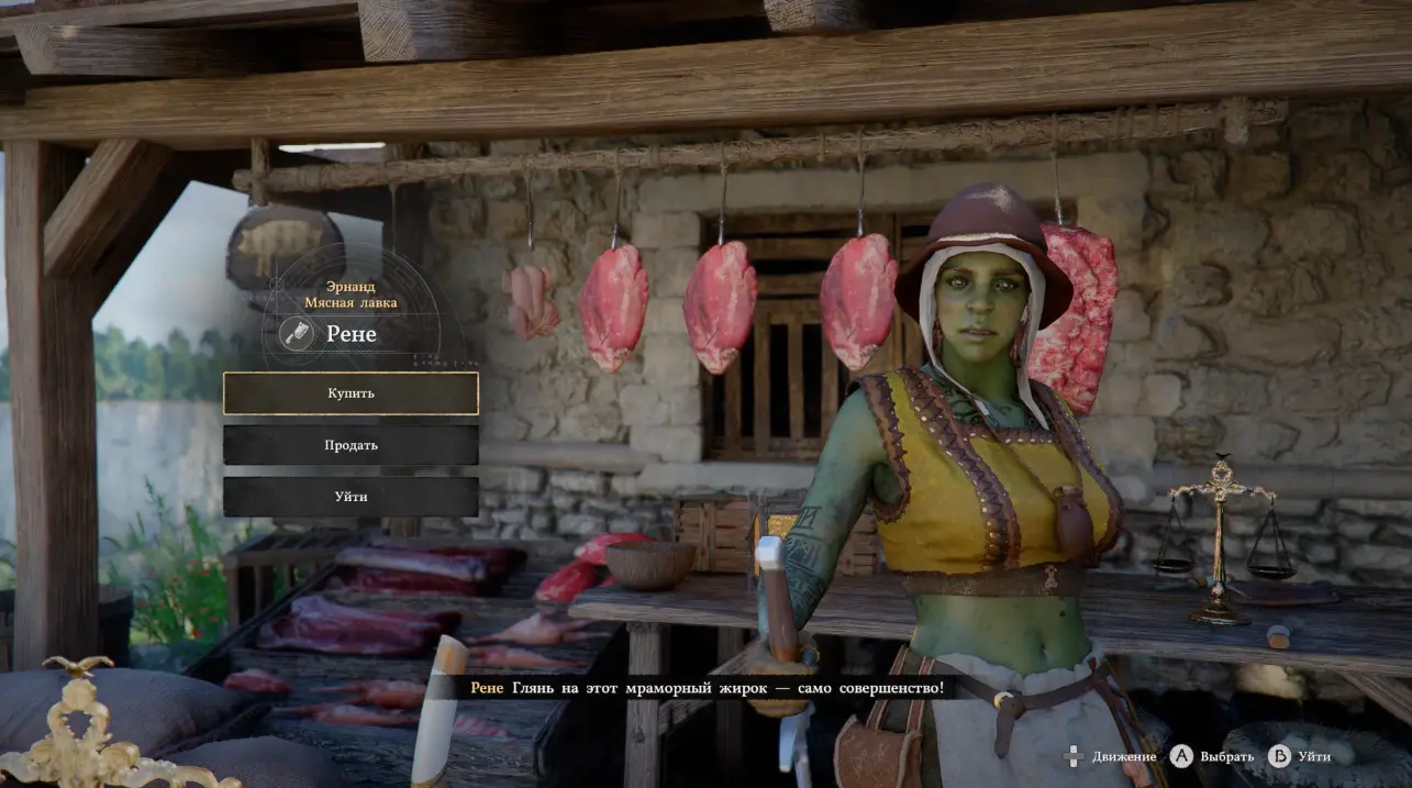Взаимодействуйте с Рене, чтобы открыть меню. Далее выберите «Купить» и выберите несколько кусков постного мяса, после чего приобретите его.