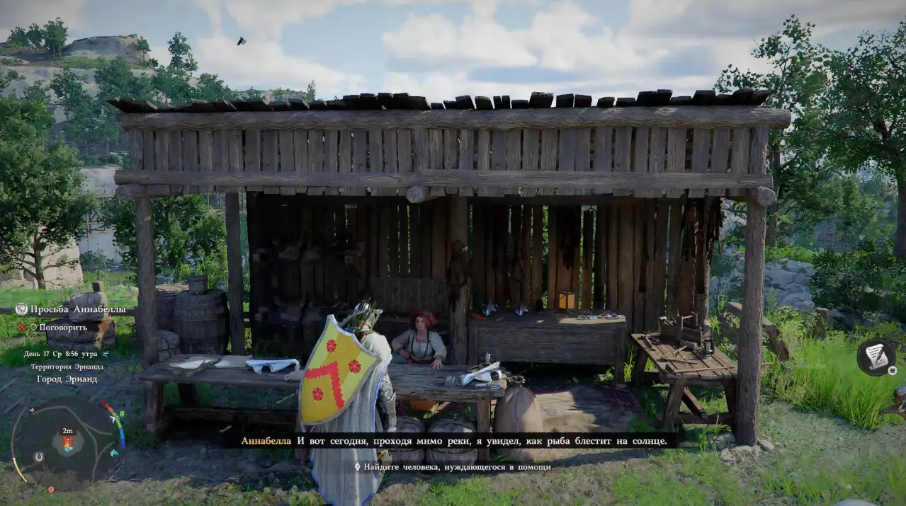 Торговка расскажет, что везде одинаковые седла, а ей такой подход совсем не близок: она бы хотела сделать настолько роскошное седло, чтобы все оборачивались, когда увидят его на лошади. На дизайн такого седла ее вдохновила блестящая рыбья чешуя и теперь Аннабелле нужен человек, который выловит ей рыбу. И этот человек вы, то есть Клифф. Принимаем просьбу и в этот момент игра научит нас механике рыбалки.