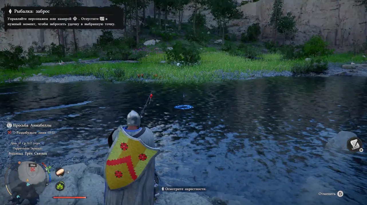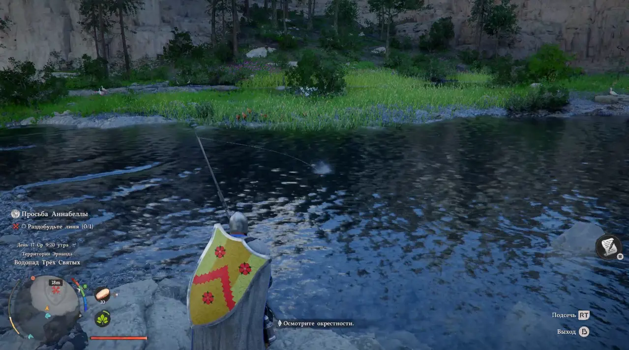 Сначала нажмите LT или ПКМ, выберите точку заброса и отпустите кнопку, чтобы отправить поплавок в воду. После этого снова зажмите LT/WASD и начинайте плавно водить леску из стороны в сторон, так вы привлекаете внимание рыбы. Как только на поверхности появятся характерные всплески, сразу выполняйте подсечку, нажав RT или ПКМ.