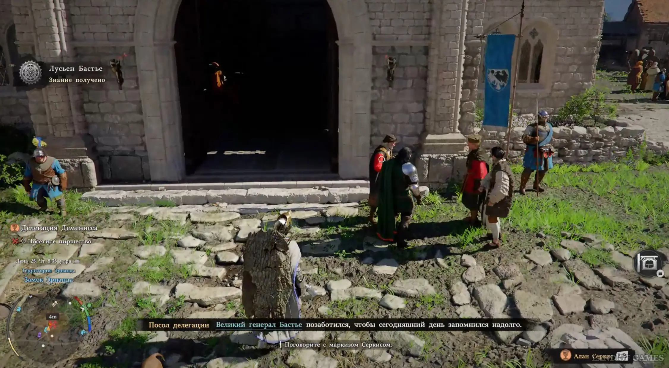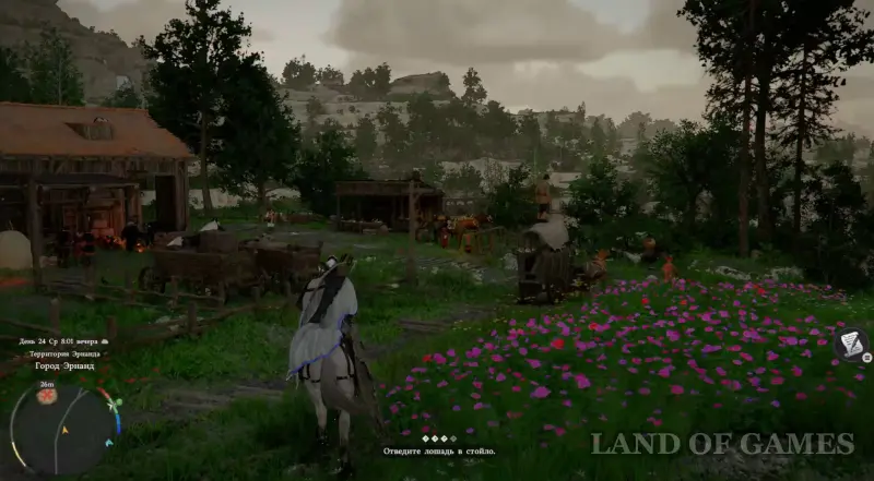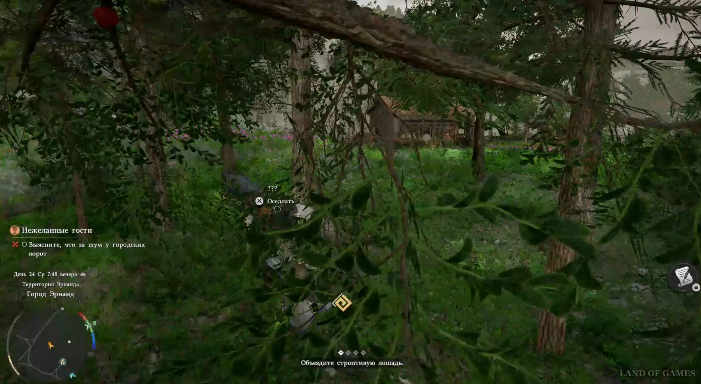 Когда успокоите кобылку, начните вести ее к конюшне, расположенной чуть севернее вашего текущего местоположения. Затем начнется кат-сцена, в рамках которой вы пообщаетесь с Дамианой касательно прибытия делегации из ее родины.