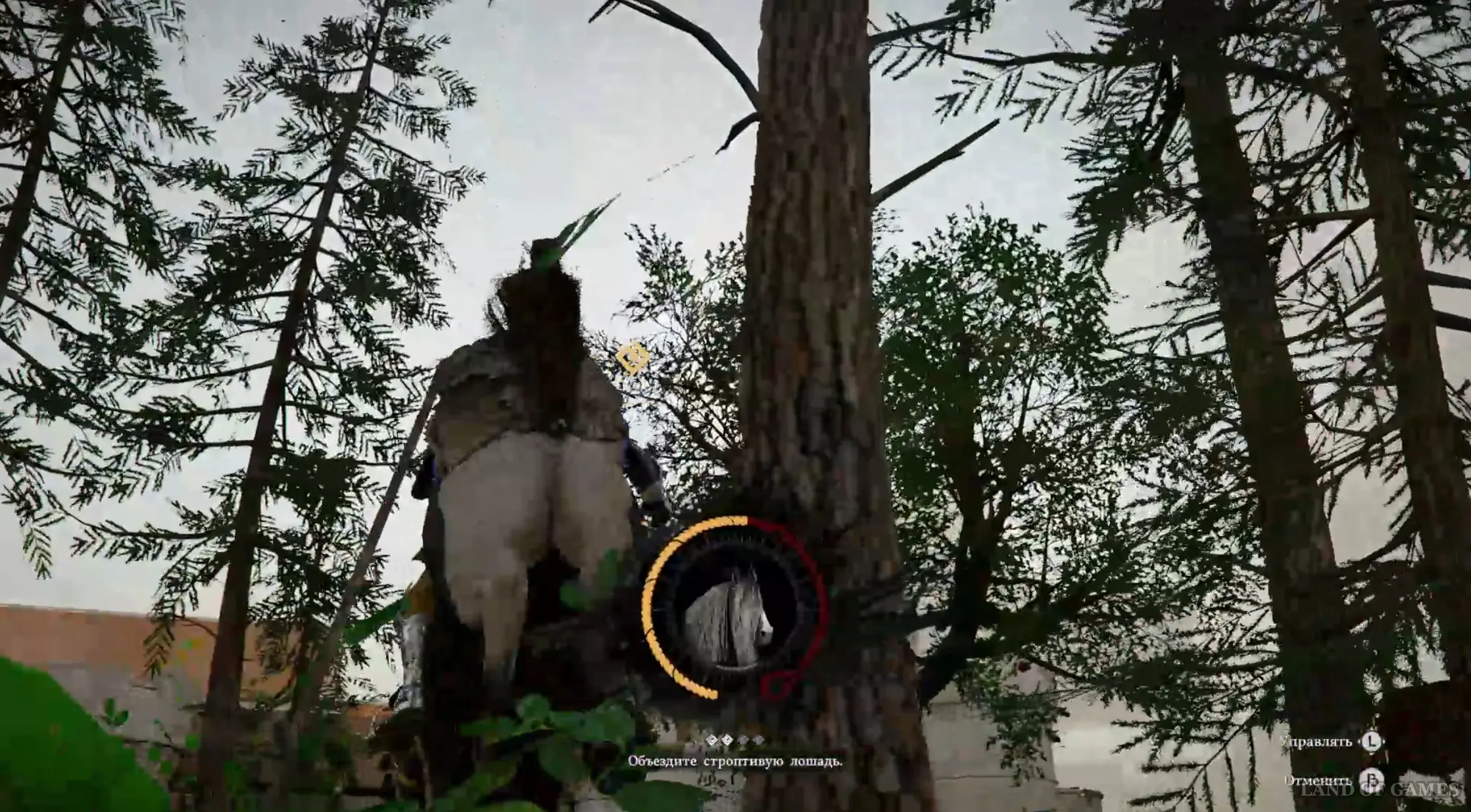 Просмотрев ролик, сразу же подбегите к кобыле и нажмите кнопку «Оседлать», чтобы забраться на нее. Тут же стартует новая мини-игра с приручением дикого скакуна. На экране появится шкала, которую вам необходимо будет полностью заполнить. Для этого нужно поворачивать камеру в сторону, противоположную взгляду лошади, то есть, если по-простому, то вы должны все время смотреть на заднюю часть животного.