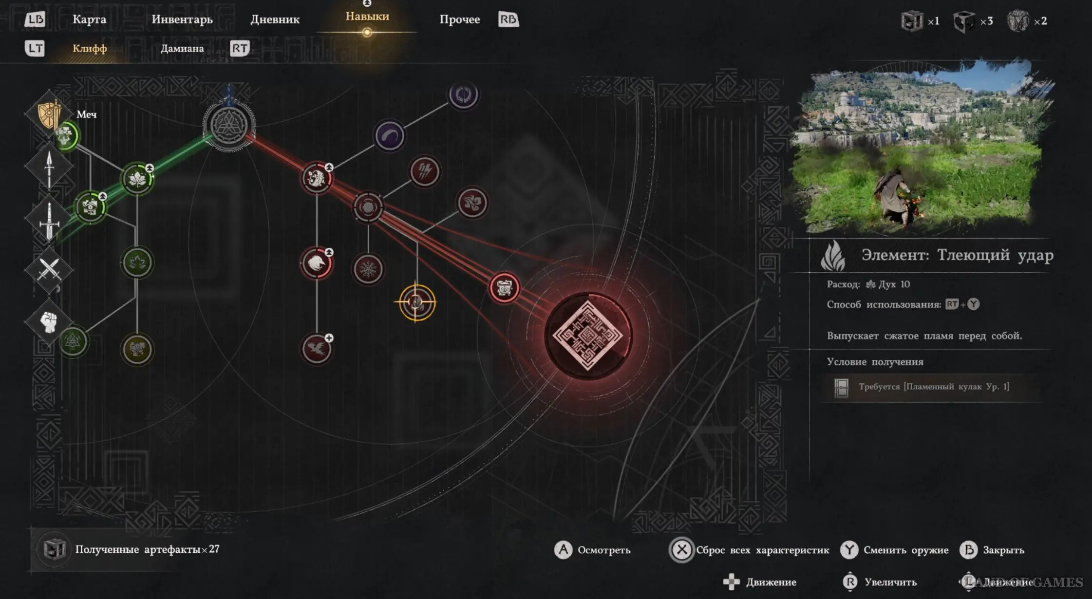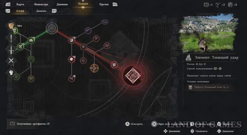Во-первых, откройте раздел «Навыки» и убедитесь, что вы улучшили Здоровье (красный круг) и Выносливость (синий круг), как минимум, до 4-го уровня (лучше и вовсе иметь шкалу жизни не менее 5-го). Далее постарайтесь разблокировать способности «Усиление стихий» и «Элемент: Тлеющий удар». Дело в том, что враг уязвим к огненному урону, поэтому вы сможете ошеломлять его атаками огнем. Впрочем, нам удалось победить босса и без данных умений.