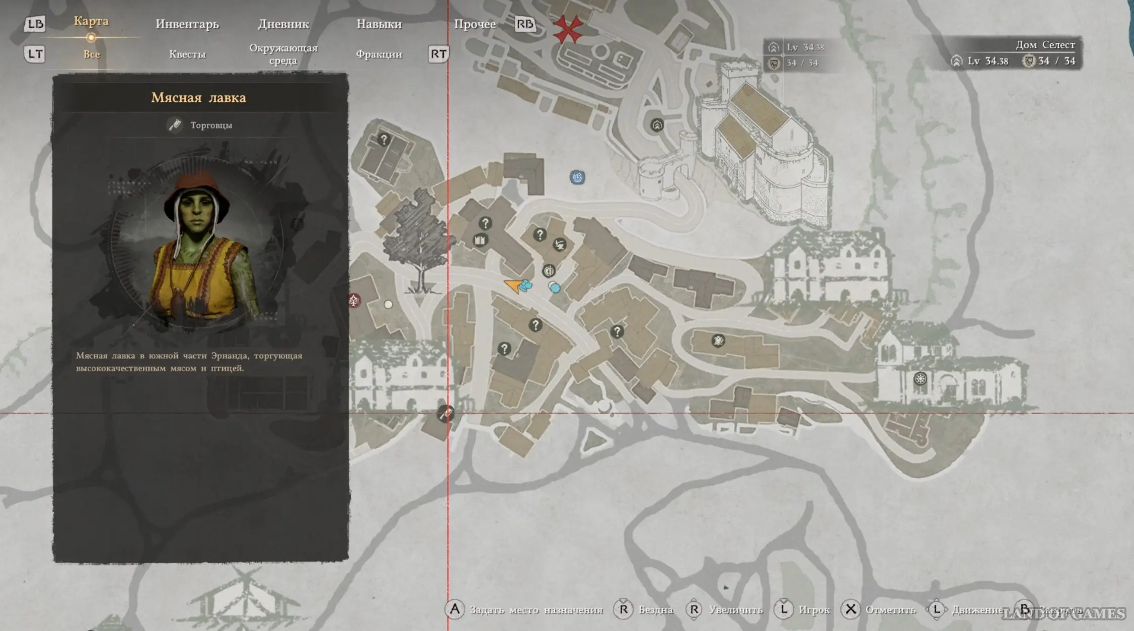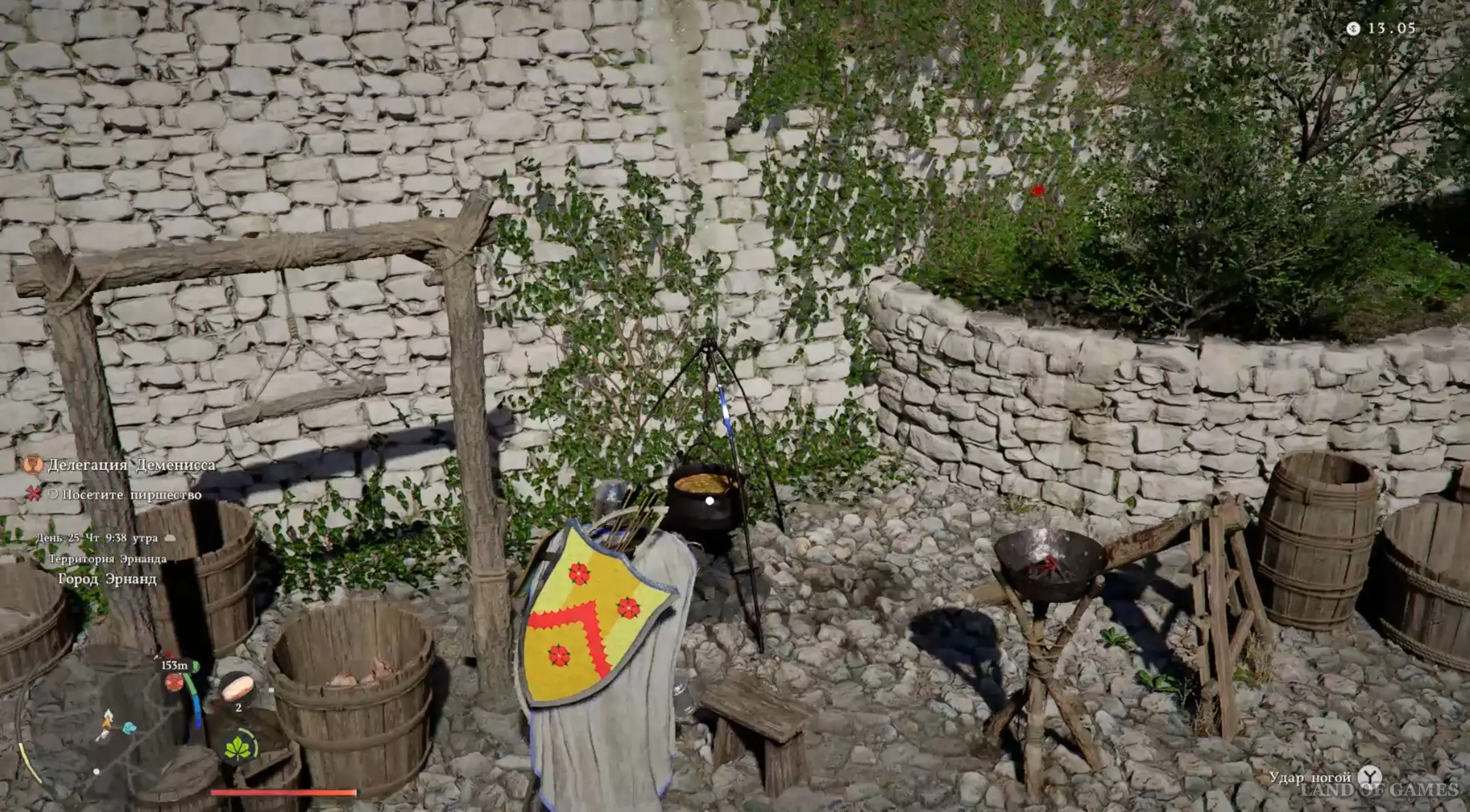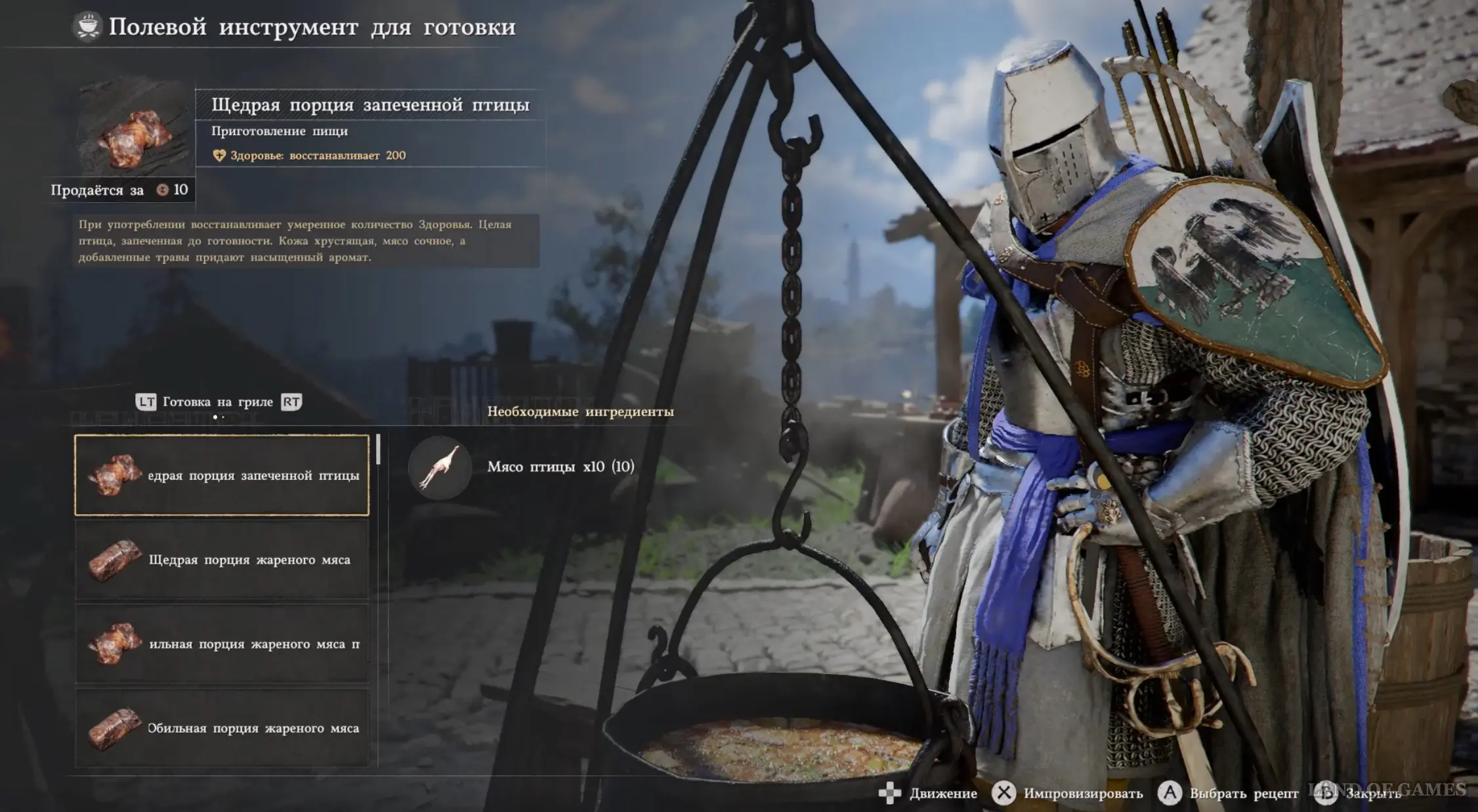 В-третьих, вам понадобится много еды. Нет, не так. Вам потребуется ОЧЕНЬ много еды. Базовый минимум – это 40-50 кусков жареного мяса и других блюд. Однако для полной безопасности лучше запастись 100-200 лечебными средствами. Добыть мясо можно с оленей, бегающих по лесу вокруг города, или купив в мясной лавке. Кстати, справа от торговки уже стоит котел, где вы сможете приготовить нужные блюда. Немного мяса также можно приобрести на Волчьем холме у своего повара.