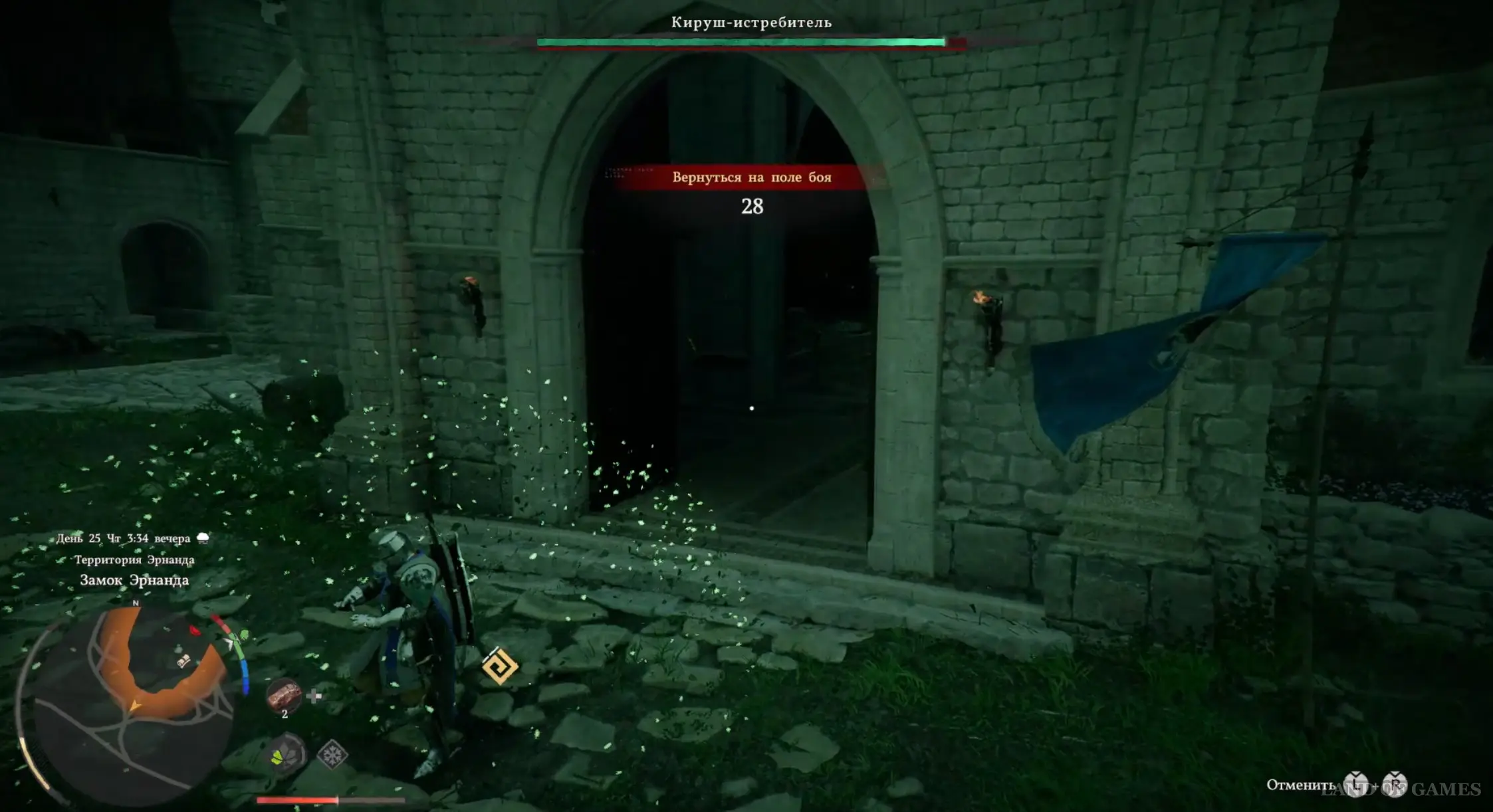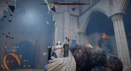 Противник становится агрессивнее и чаще выполняет продолжительные комбо, активируя режим суперброни (начинает светиться синим и получает неуязвимость). В этом состоянии через пару секунд он начинает наносить серию мощных ударов, от которых практически невозможно уклониться или блокировать. Вам нужно как можно скорее бежать к выходу из замка и спрятаться за стеной слева или справа. Оставайтесь тут и ждите, пока босс не закончит атаковать. Как правило, он застревает за углом и не достает до персонажа.