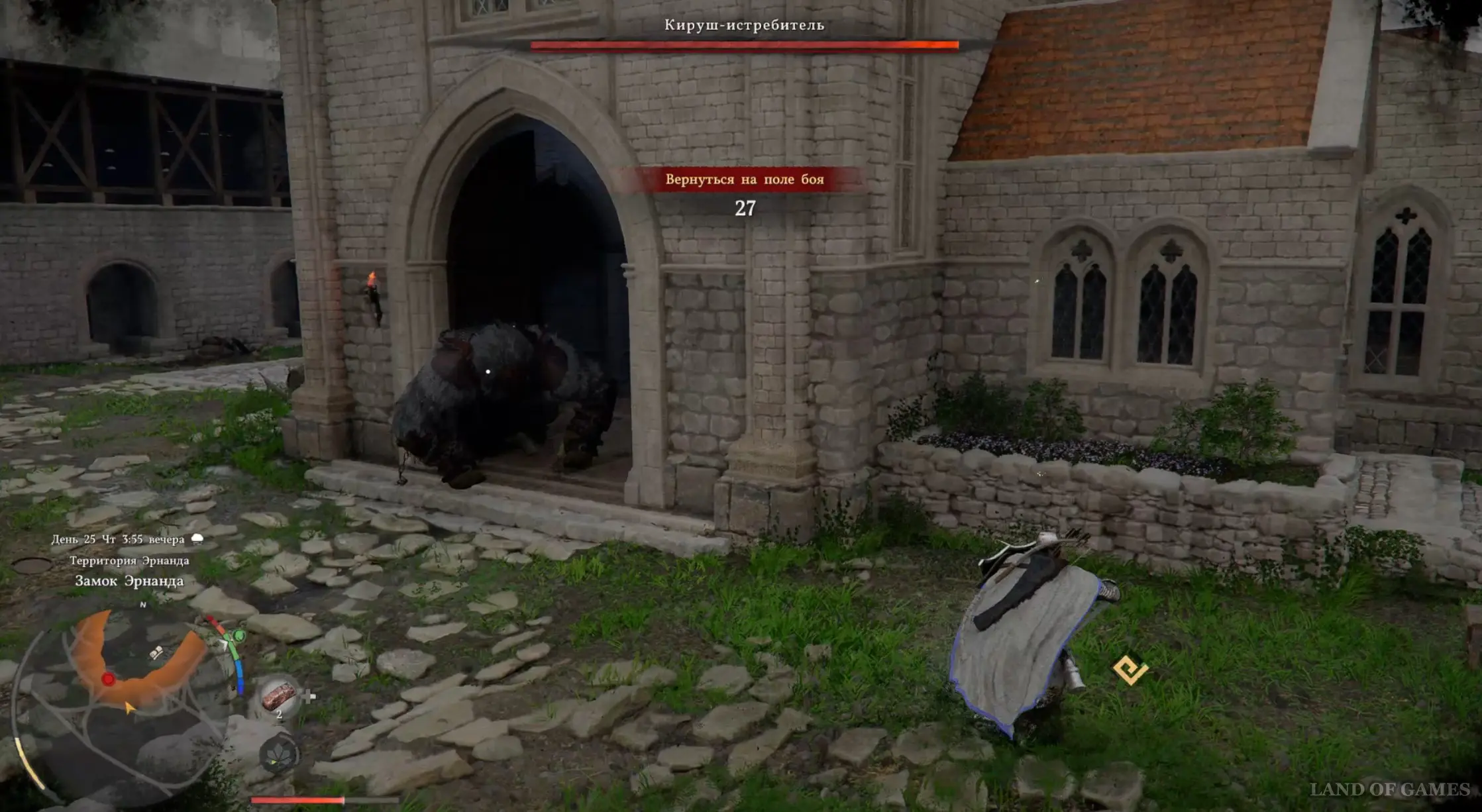 Выше мы отметили, что вы можете выходить из здания. На этом этапе тоже выбирайтесь наружу, однако на этот раз босс начнет следовать за вами, но к счастью, на улице он будет менее агрессивным и частенько начнет пятиться назад, пытаясь вернуться в замок, что позволит вам совершать по нему несколько ударов.