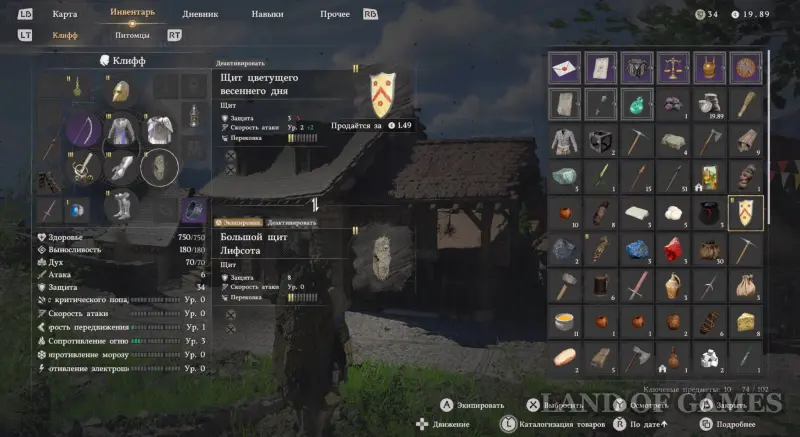 Если же говорить об оружии, то подойдут Меч повелителя и Деревянный щит серого волка (или Щит цветущего весеннего дня), прокаченные до 3-4 уровня. Не берите тяжелый щит, так как из-за него вы будете медленно двигаться! К тому же даже самый прочный щит не сможет заблокировать удары противника, а парировать атаки вам не удастся, поэтому берите максимально легкий щит.