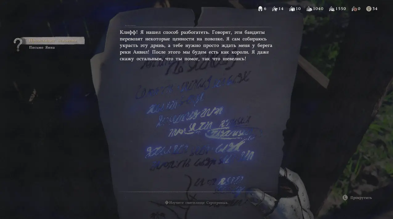 Из сообщения вы узнаете, что Янн нашел способ разбогатеть: он планирует забрать у бандитов ценности и просит Клиффа ждать его на берегу у реки Анвил.