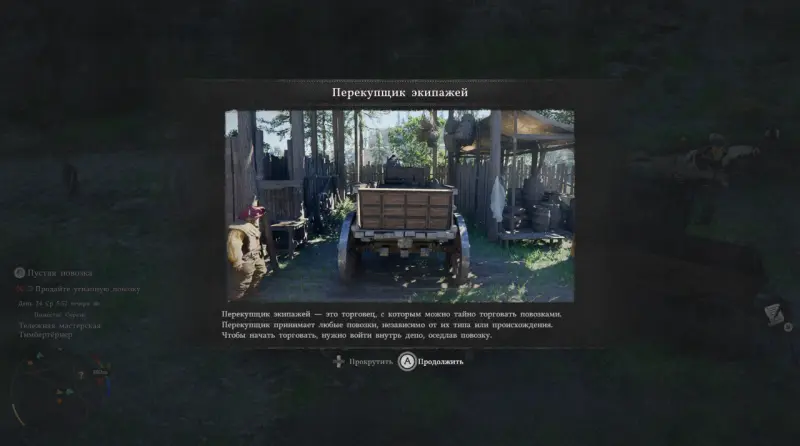 После кат-сцены игра даст задание сесть в повозку. И сразу же после этого обучит вас механике продажи телег перекупщику. У вас могут купить любую повозку, даже краденную.