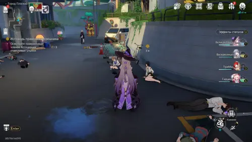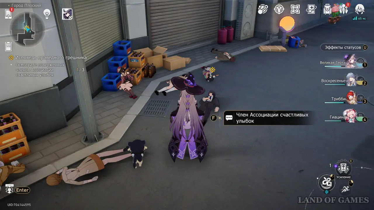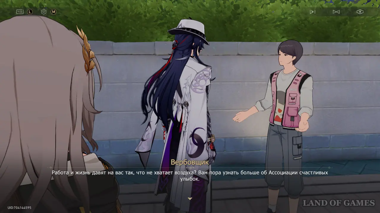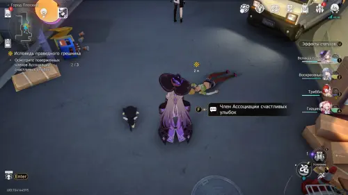 Переместитесь к якорю «@Вход» в городе Плоский. Если хотите, можете сперва пройтись по улице и послушать разговоры прохожих — а можете сразу отправляться к Эшвейлу, которого пытаются завербовать в Ассоциацию счастливых улыбок.