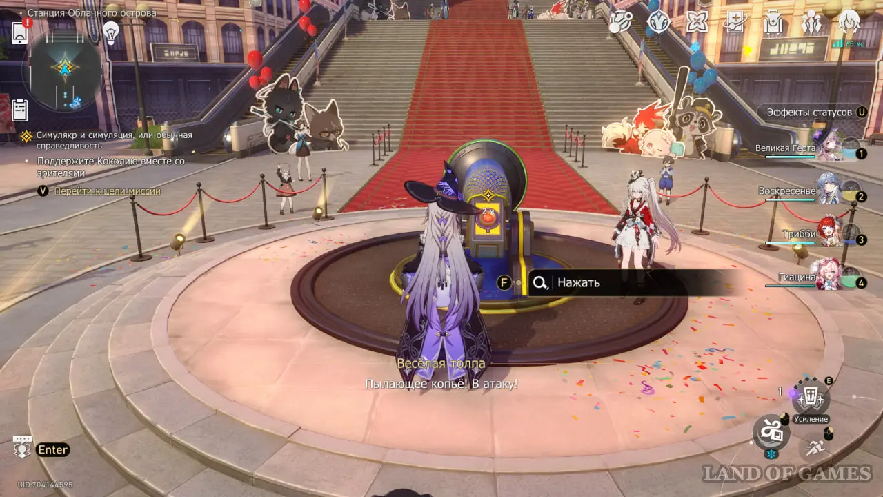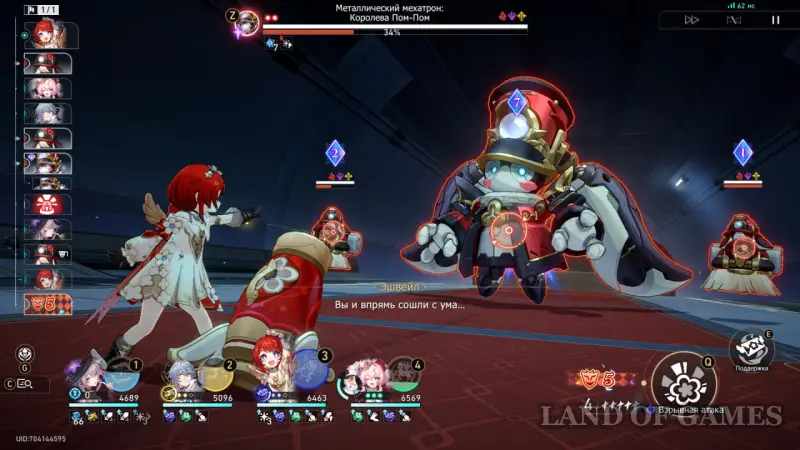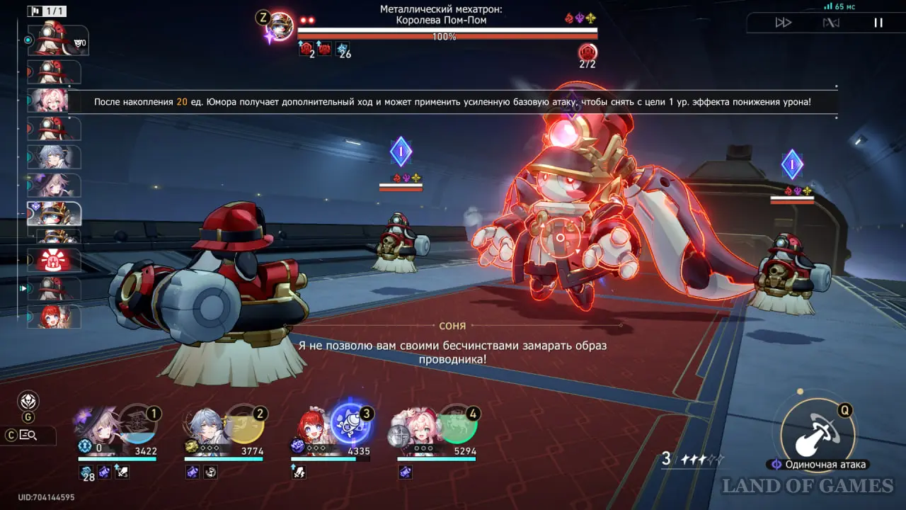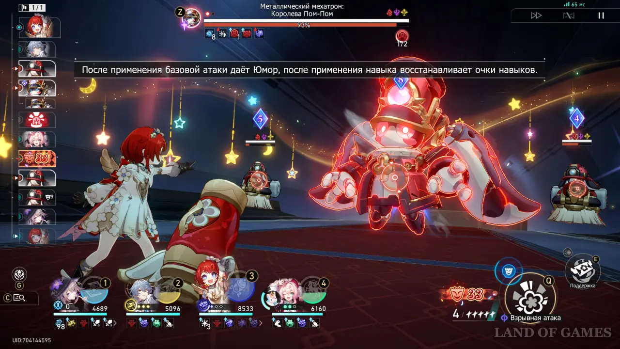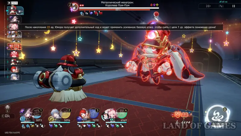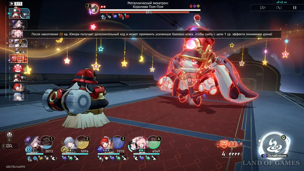 Для сражения лучше всего подойдут герои огненного, электрического и мнимого типов урона, а в особенности — персонажи пути Радости, способные самостоятельно накапливать Юмор. Если таких персонажей у вас нет, можно взять любых сильных героев, в том числе с групповыми атаками. Также команде поможет надежный хилер, способный уберечь весь отряд от групповых ударов Пом-Пом.