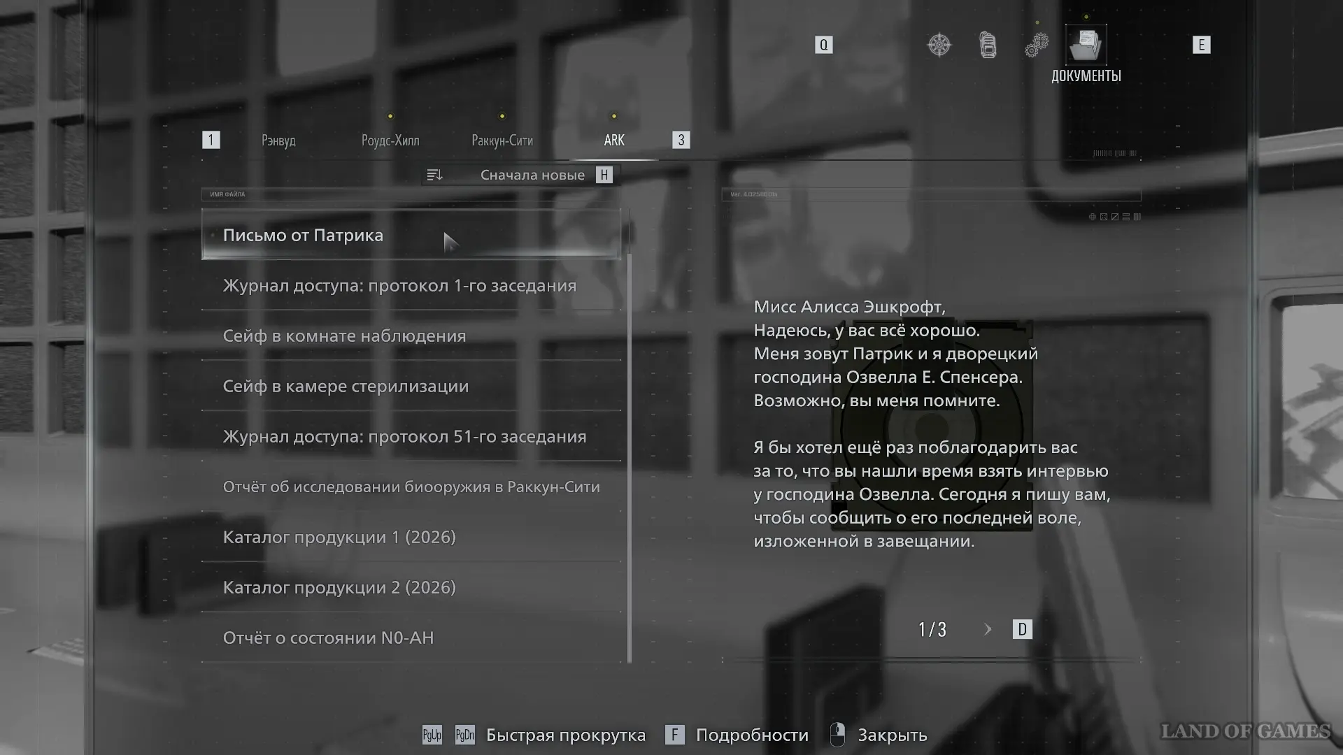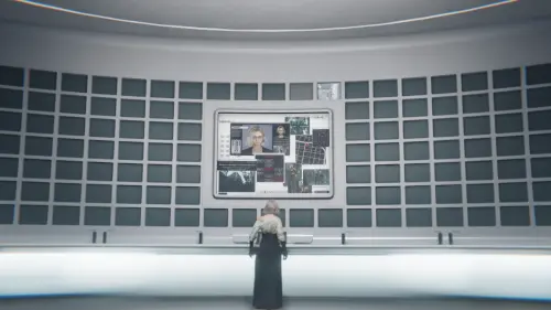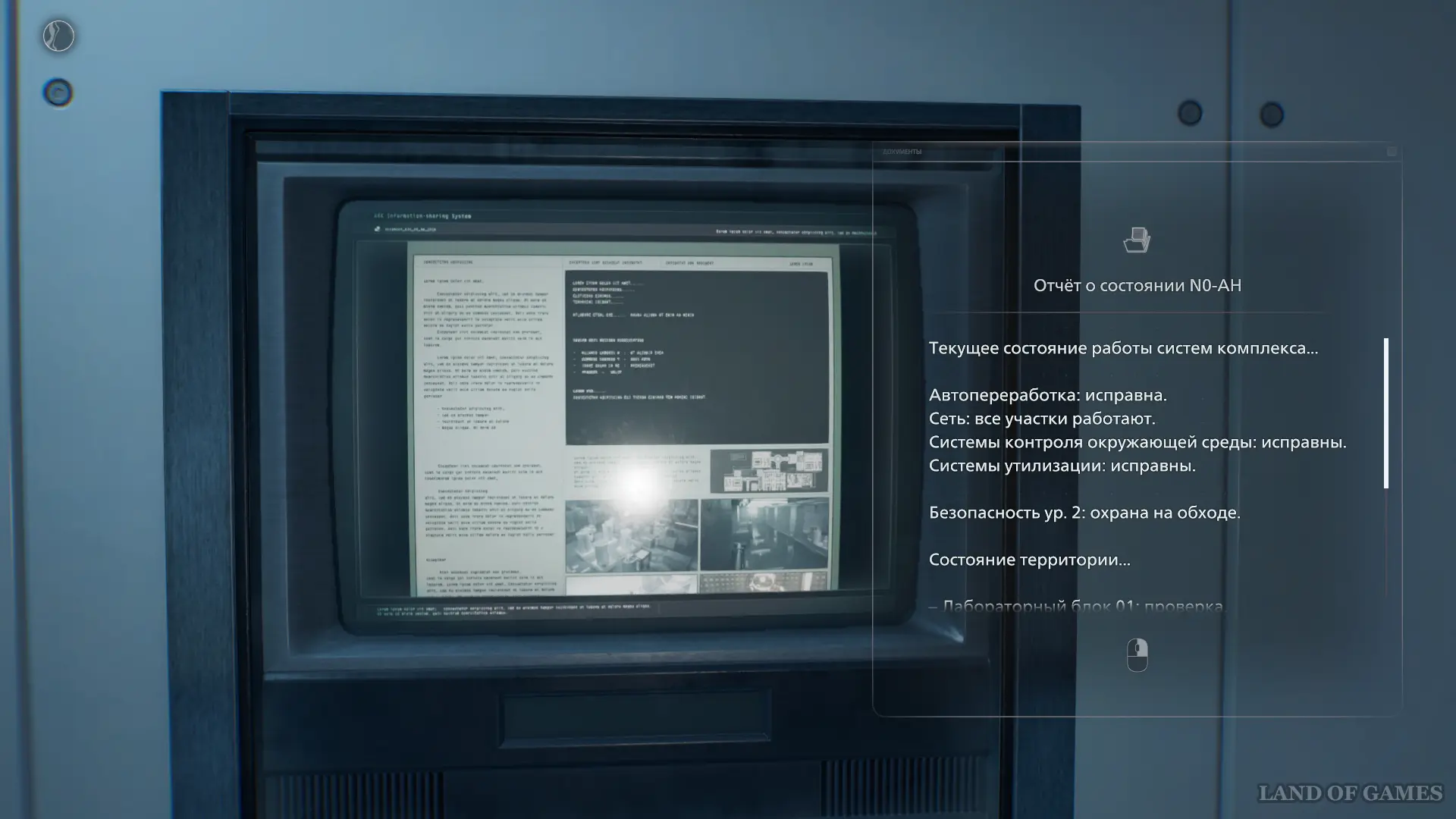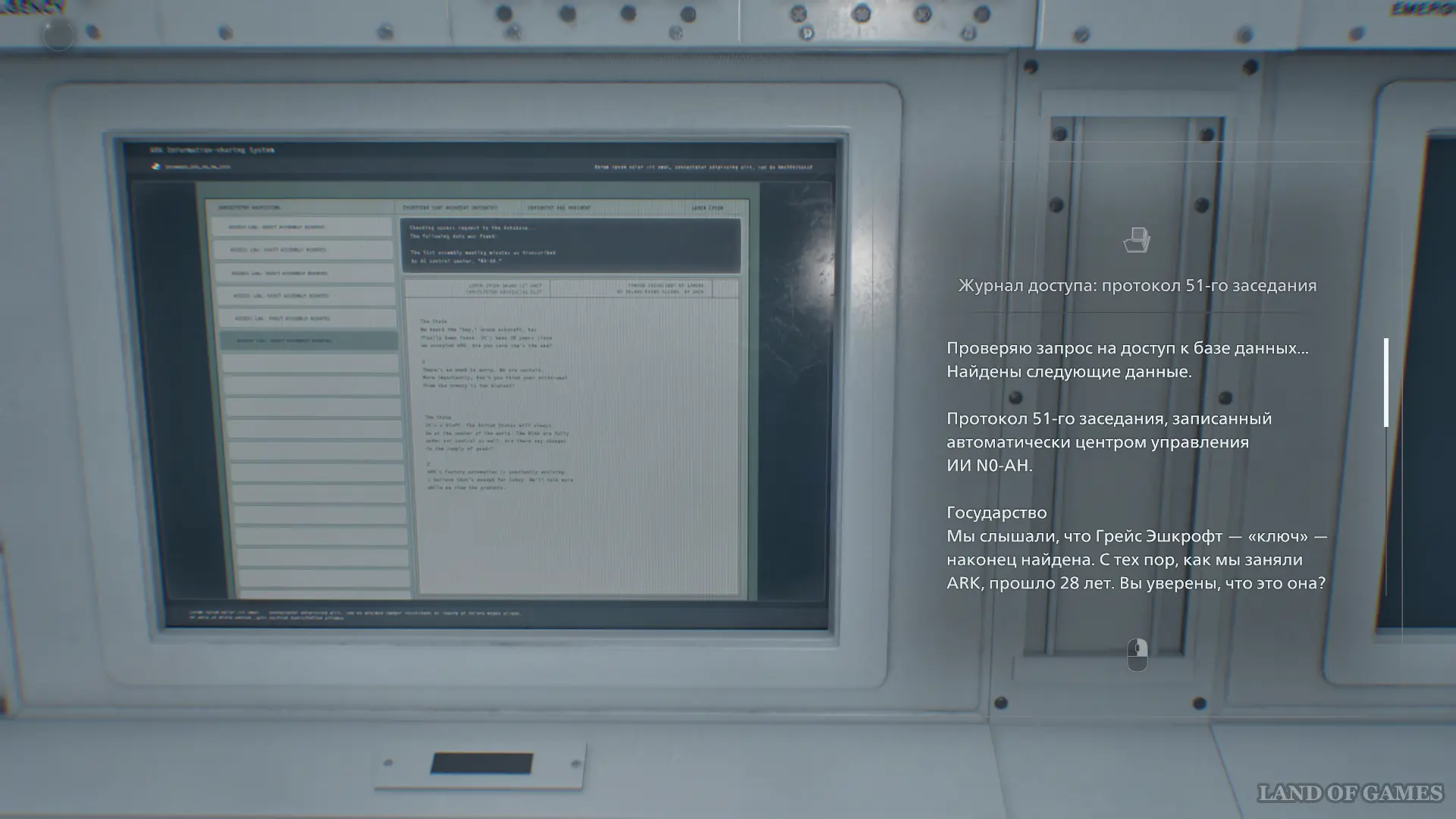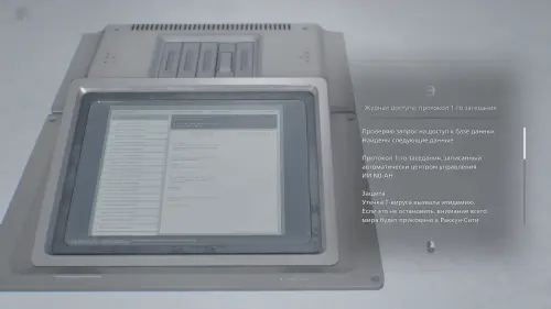 Оказавшись в лобби, поверните налево и зайдите в Комнату наблюдения. Подойдите к монитору и изучите Журнал доступа: протокол 51-го заседания.