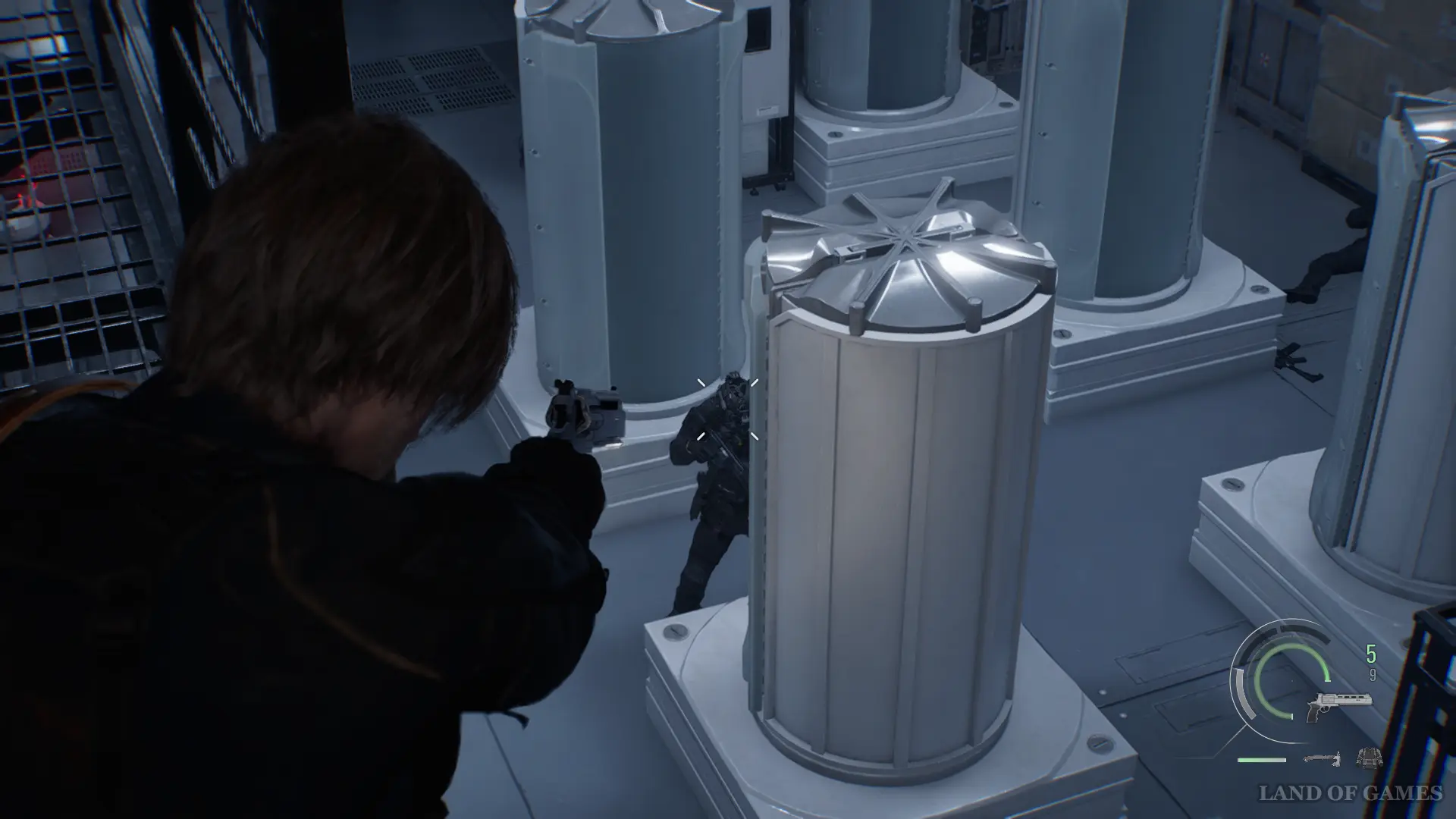 При желании вернитесь в комнату сохранения, а затем направляйтесь на Склад. При входе вас вновь встретят четверо противников. Если действовать быстро, можно устранить их точными выстрелами в голову из снайперской винтовки.