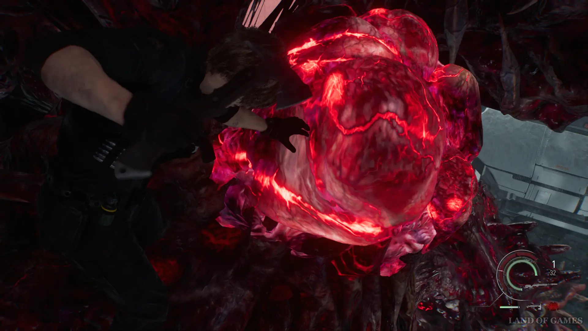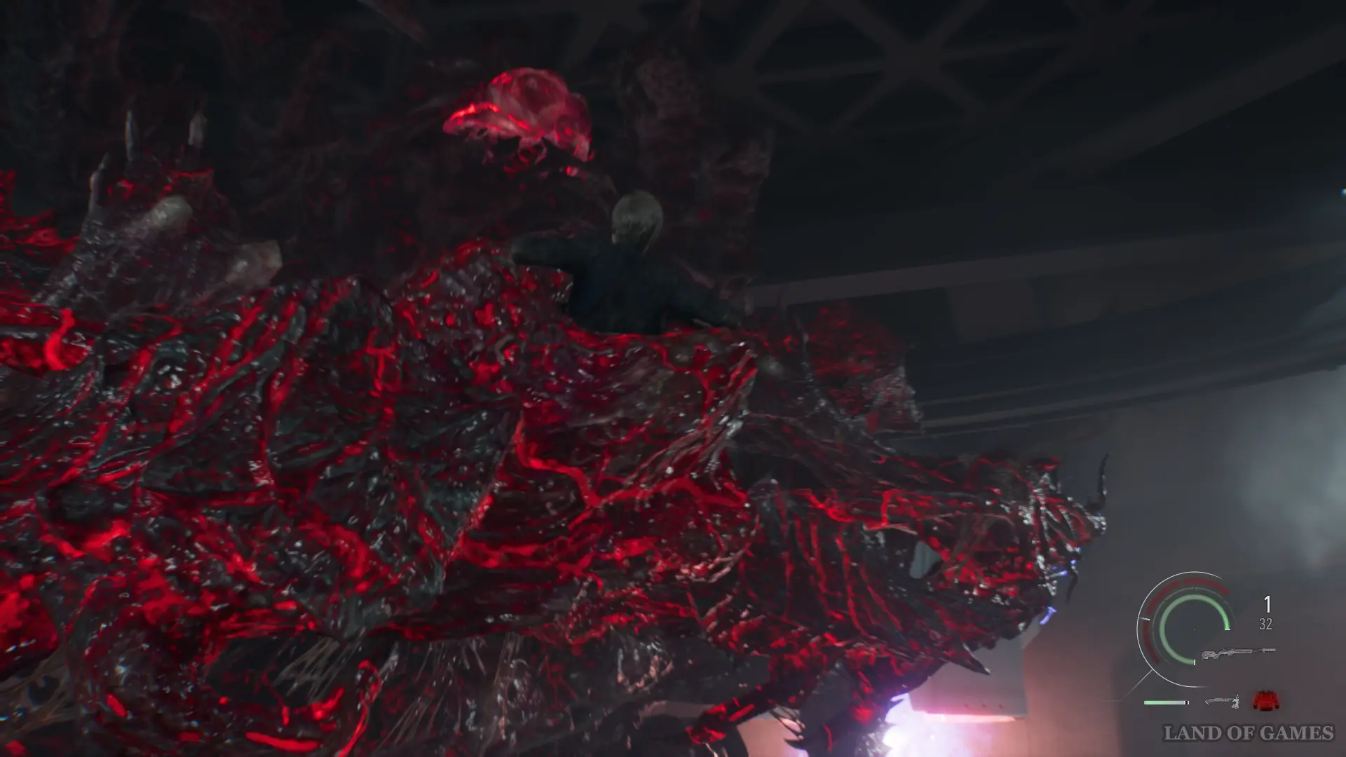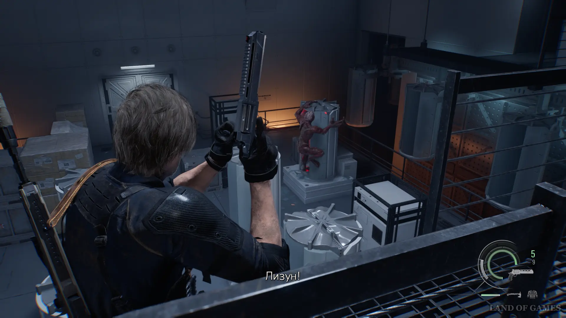 Как только вы спуститесь на нижний уровень, новые враги начнут заполнять склад. Обратите внимание на красный резервуар, расположенный в северной части складского помещения. Разрушьте его выстрелом, чтобы выпустить лизуна, который также вступит в схватку с противниками. После этого вам останется лишь разобраться с монстром.