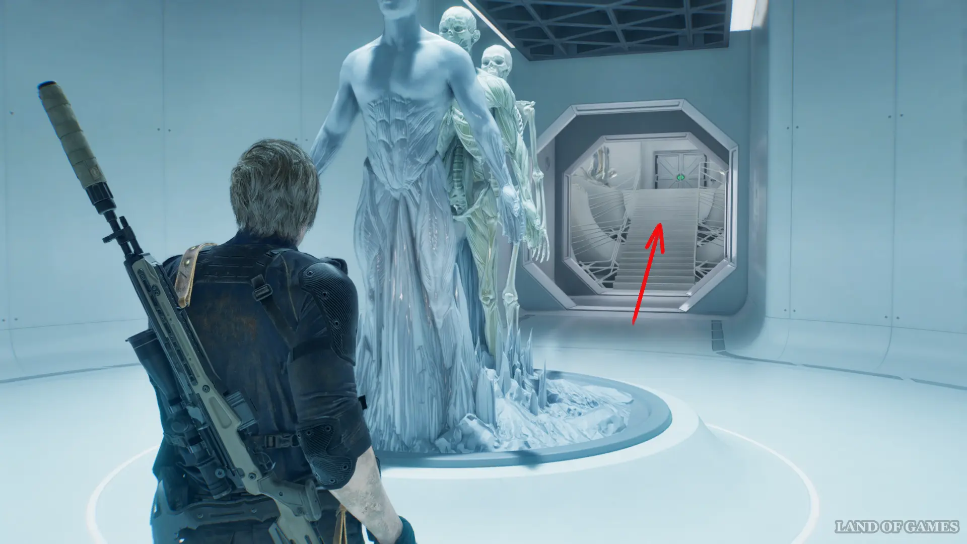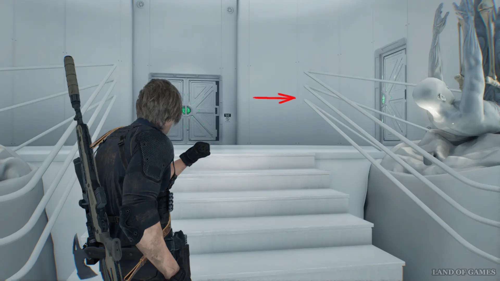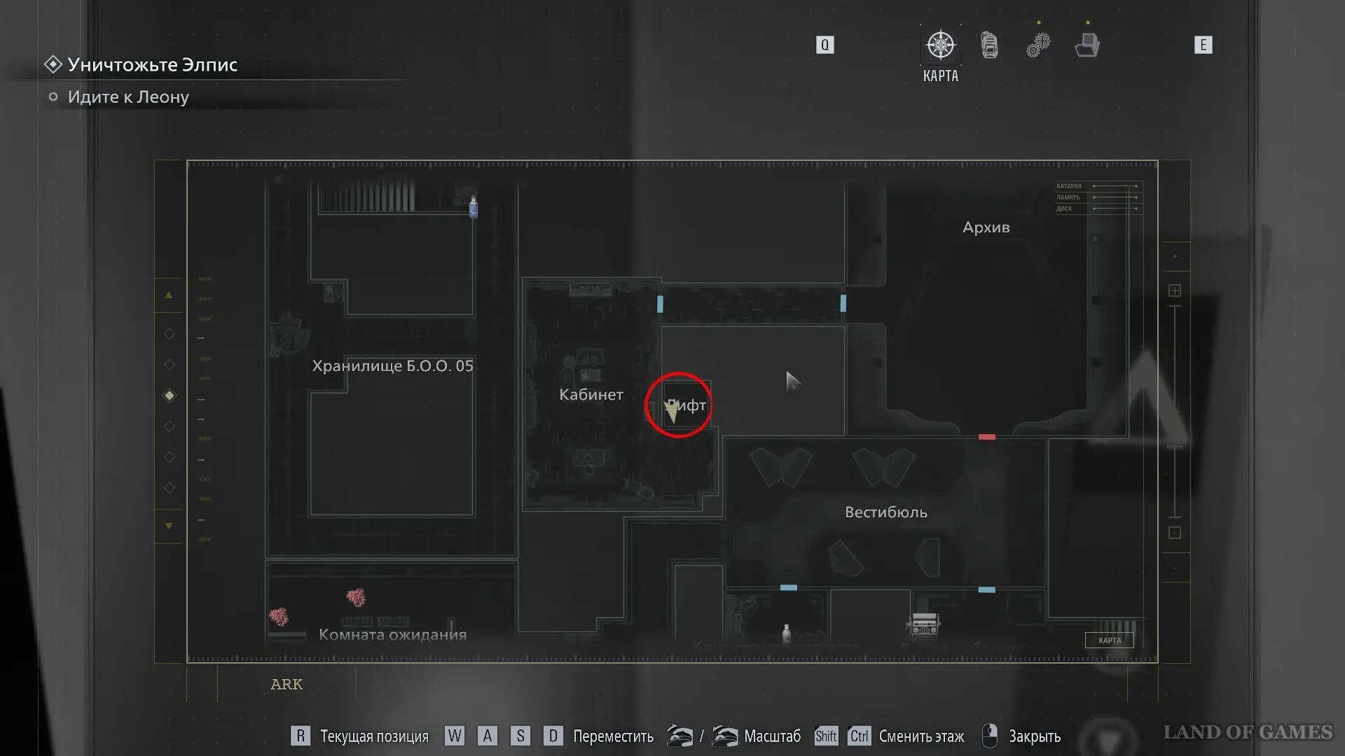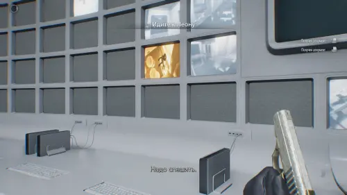 Проберитесь через офис и воспользуйтесь лифтом, чтобы попасть к Леону.