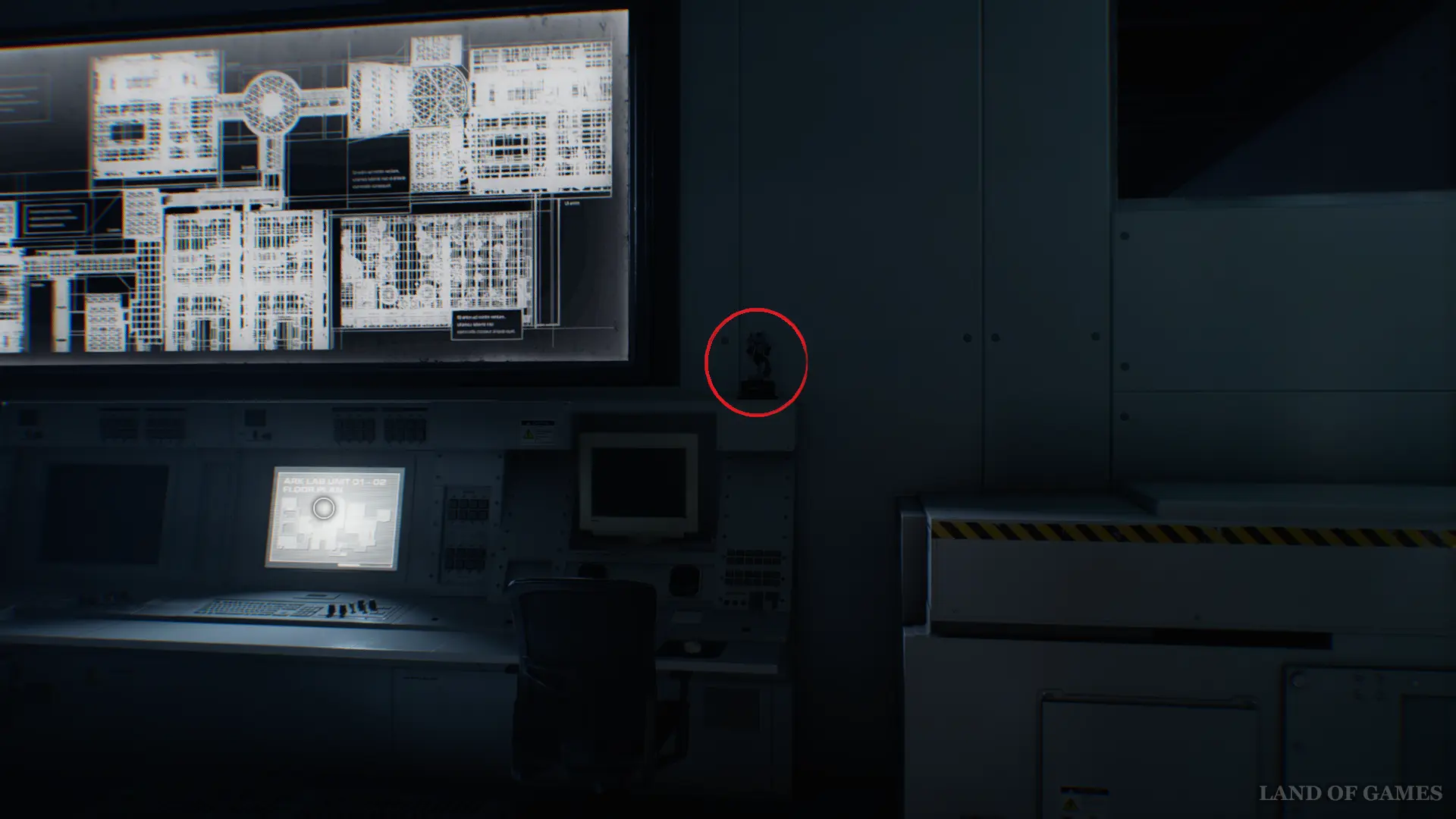 Следуйте далее, пока не окажетесь в Командном пункте. Под мониторами наблюдения вы найдете статуэтку Енота. Разбейте ее и осмотрите кабинет.