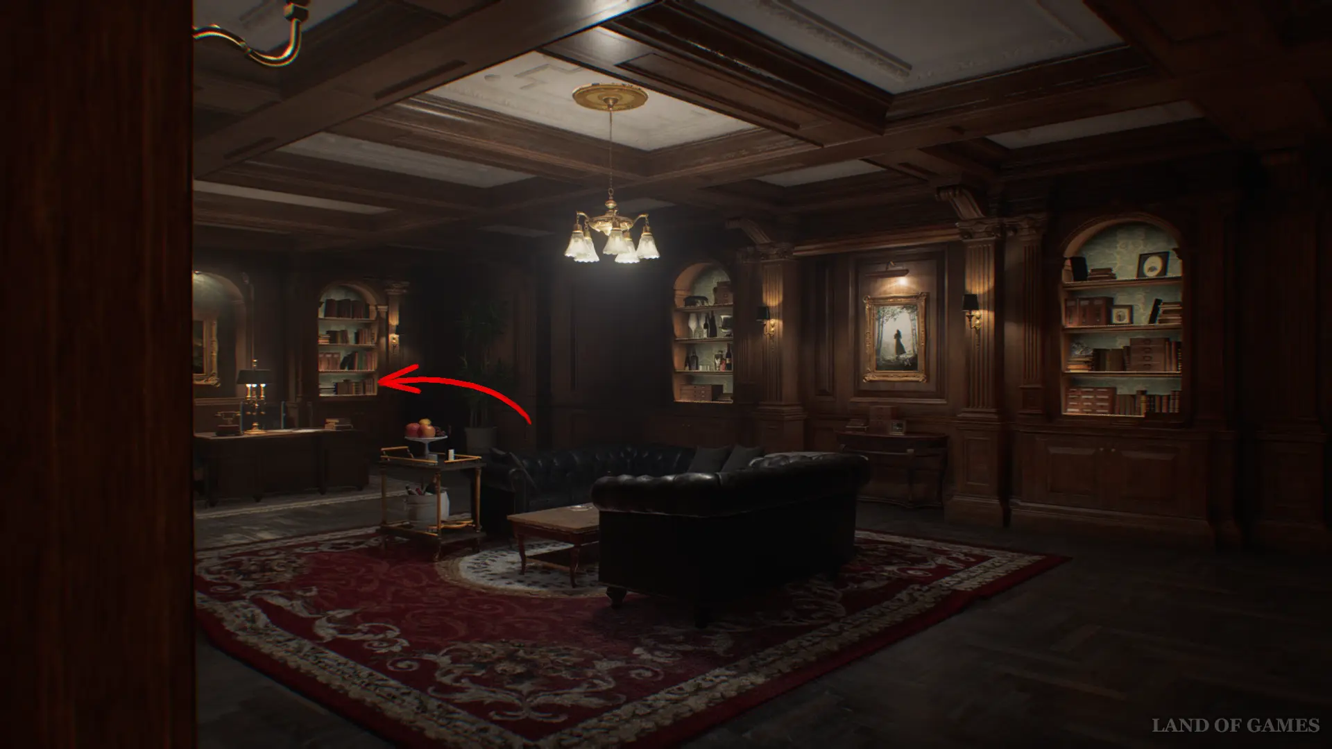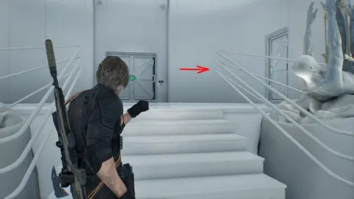 Покинув склад, вы окажетесь в выставочном зале со скульптурами. Поднимитесь по лестнице и зайдите в зеленую дверь справа, ведущую в Гостевую.