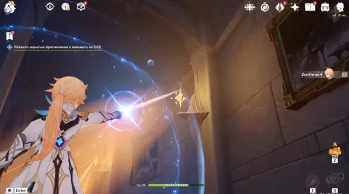 Когда здоровье врага упадет почти до 0%, он снова восстановит свою полоску здоровья и взмоет вверх к красной картине, начав стрелять в вас снарядами. Направьте камеру на золотой символ и используйте способность Декса (клавиша «Т»), чтобы вытянуть силу из пространственного разлома. Далее наведите камеру на самого Меланта и выстрелите в него накопленной энергией, чтобы нанести ему значительный урон.