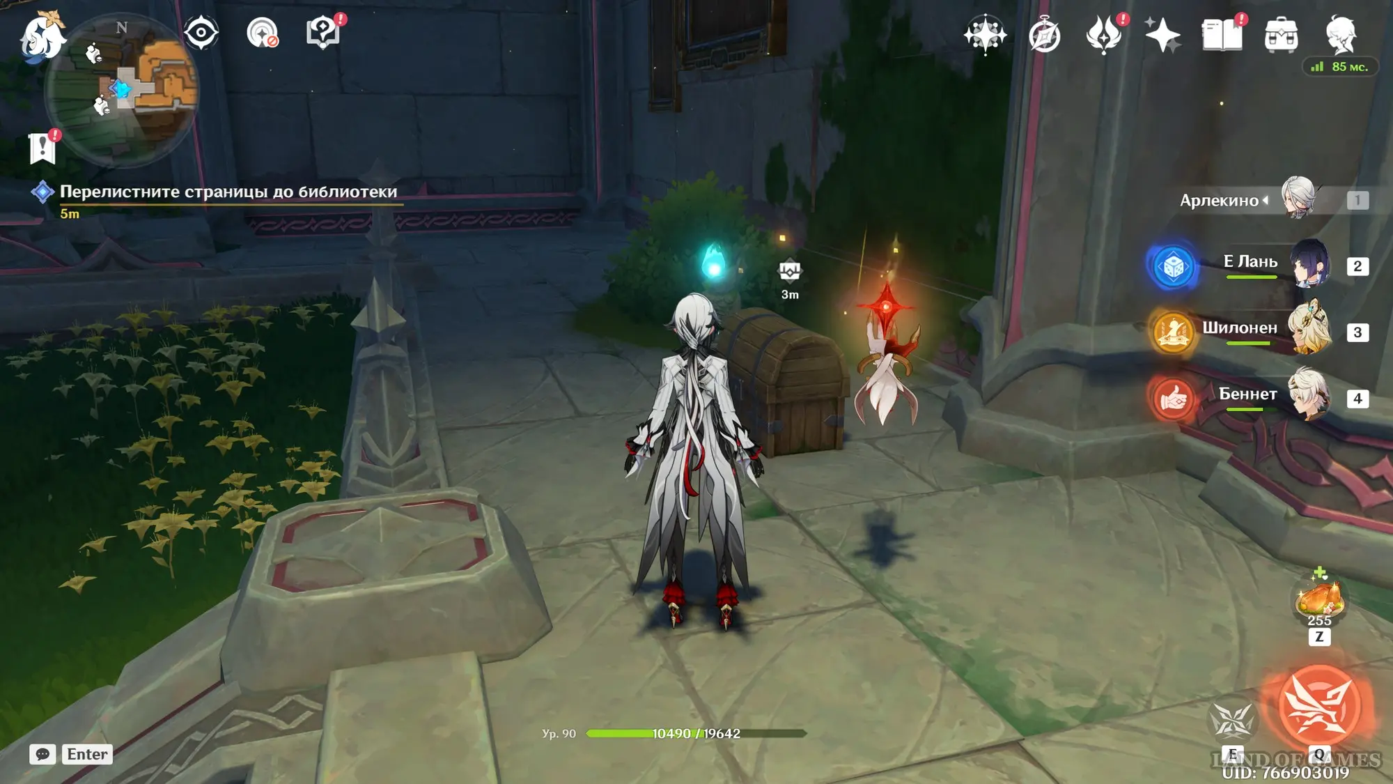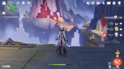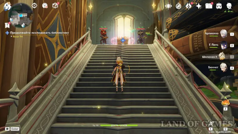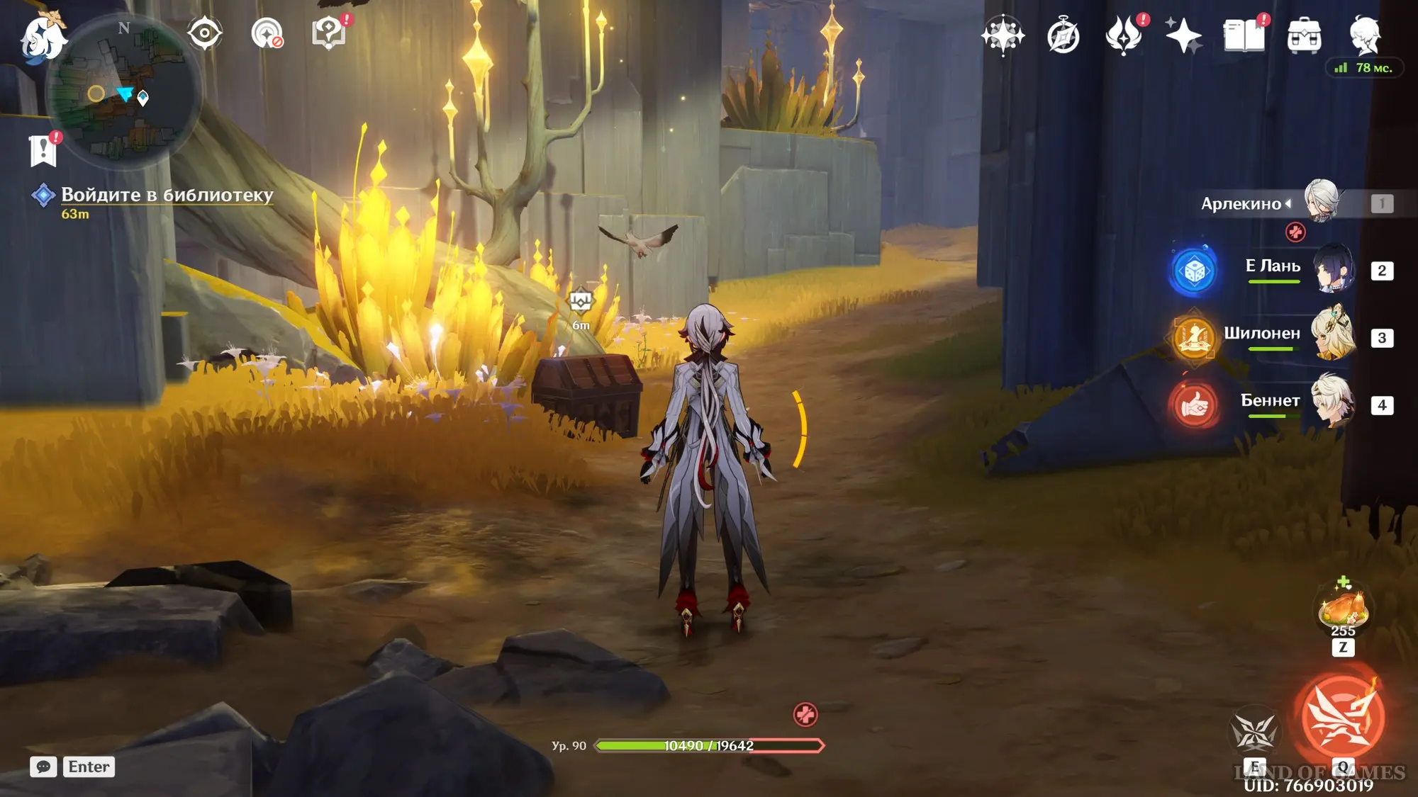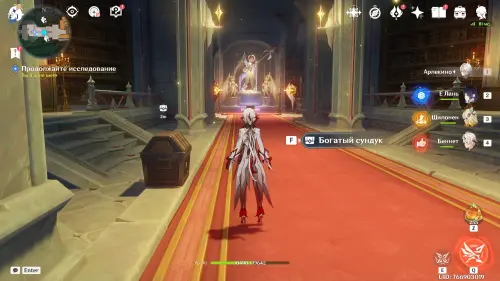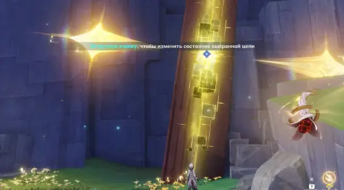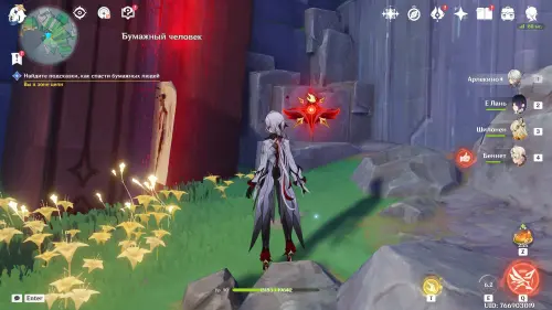 Бегите вперед к драгоценному сундуку и посмотрите новый ролик. После его просмотра заберите содержимое сундучка, а затем пройдите налево и встаньте на страничку, чтобы подняться наверх. Продолжайте следовать за маркерами, разобравшись по пути с двумя хиличурлами и открыв обычный сундук.