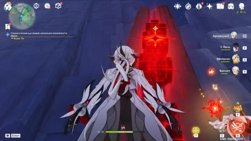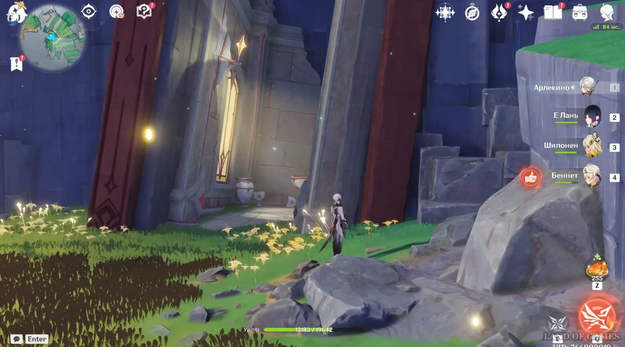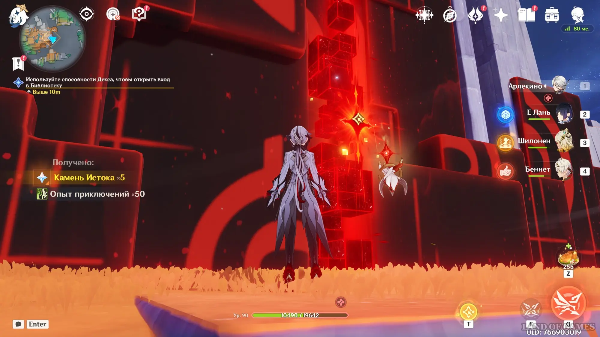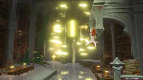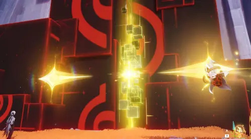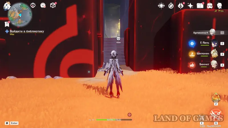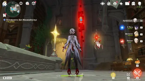 Теперь поднимитесь наверх к входу в Библиотеку, который закрыт огромной красной стеной. Активируйте телепорт, поверните камеру вправо и посмотрите на красные блоки и нажмите клавишу «Т». Затем зажмите ЛКМ, поверните мышку вправо или влево и отпустите кнопку, дабы разблокировать проход в сооружение.