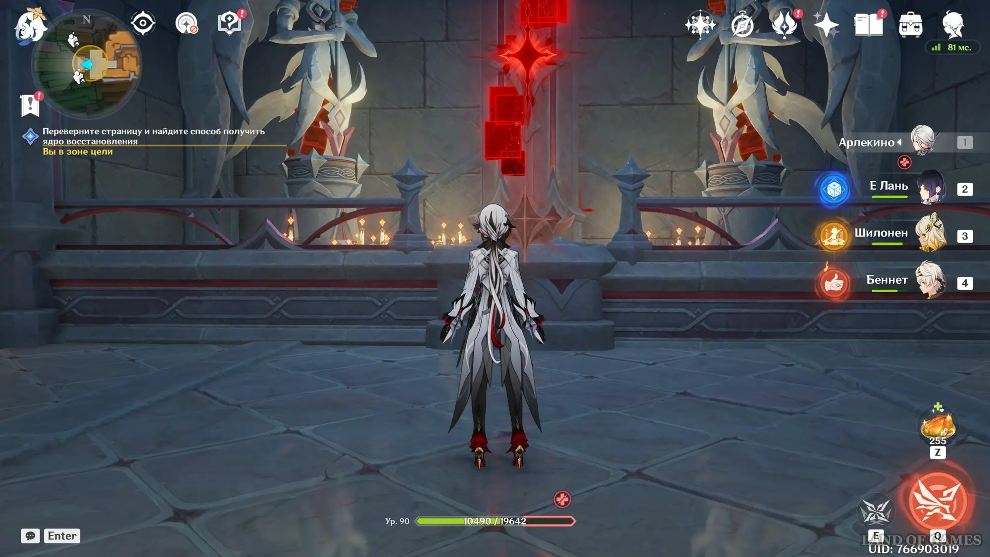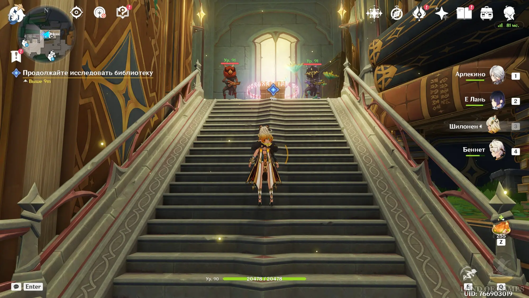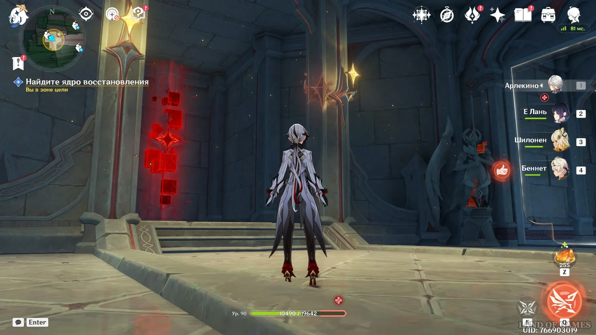 Теперь поднимитесь наверх к входу в Библиотеку, который закрыт огромной красной стеной. Активируйте телепорт, поверните камеру вправо и посмотрите на красные блоки и нажмите клавишу «Т». Затем зажмите ЛКМ, поверните мышку вправо или влево и отпустите кнопку, дабы разблокировать проход в сооружение.