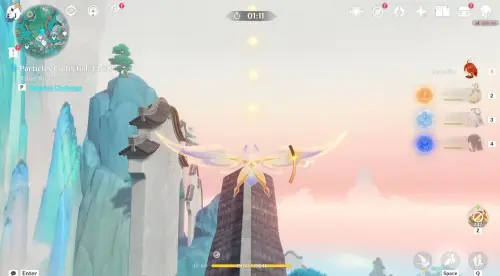 После очередной беседы вы тут же начнете второе испытание по сбору Гео частиц. На этот раз вам необходимо будет притягиваться к гарпастумам (клавиша «Т»), а затем лететь вперед (ПКМ) или наверх (Пробел), собирая по пути желтые сферы.