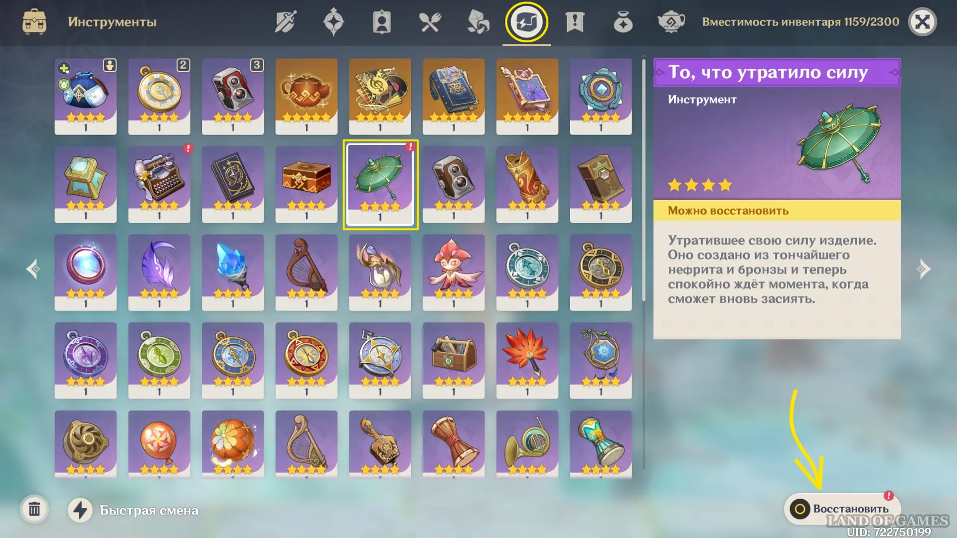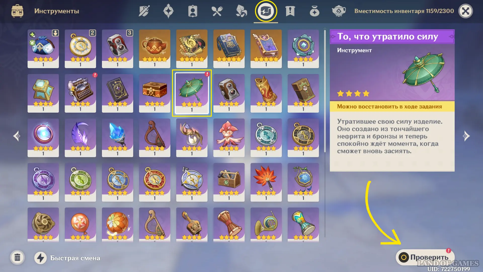 - Выбив героиню на свой аккаунт, найдите ее в меню персонажей и заберите подарок – предмет «То, что утратило силу»;