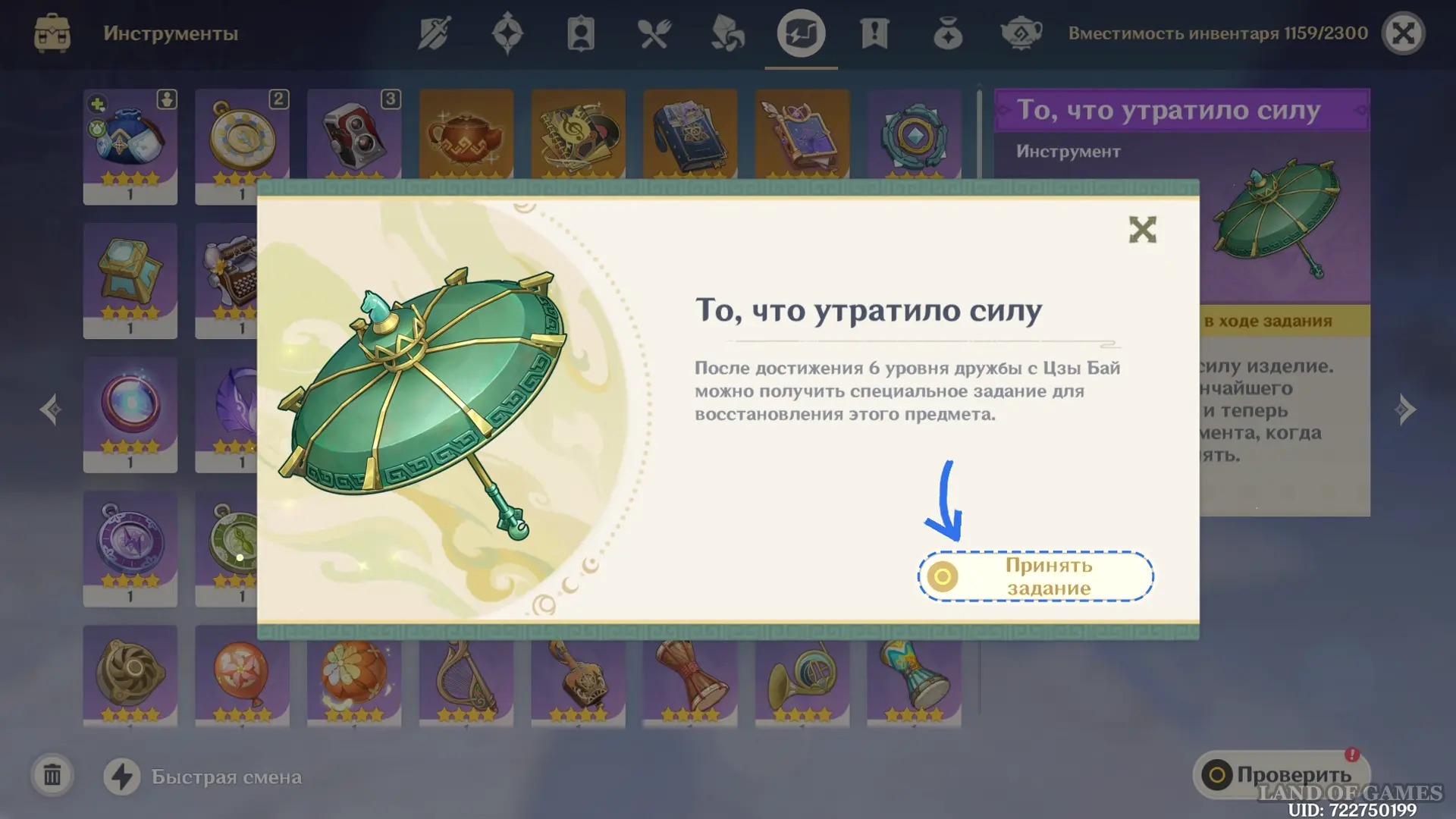 После достижения 6-го уровня отношений перейдите в инвентарь (раздел «Инструменты»). Найдите предмет и нажмите кнопку «Проверить» — вам станет доступно принятие квеста.