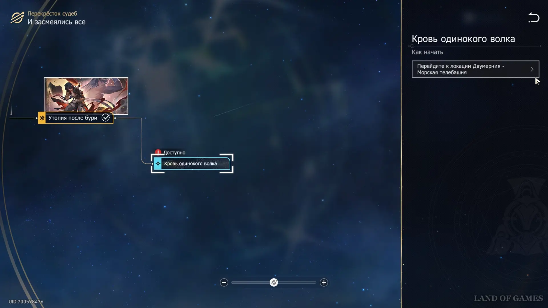 Квест «Кровь одинокого волка» появится на карте Морской телебашни сразу после завершения актуального сюжета «И засмеялись все» и будет доступен для прохождения в Перекрестке судеб «И засмеялись все».